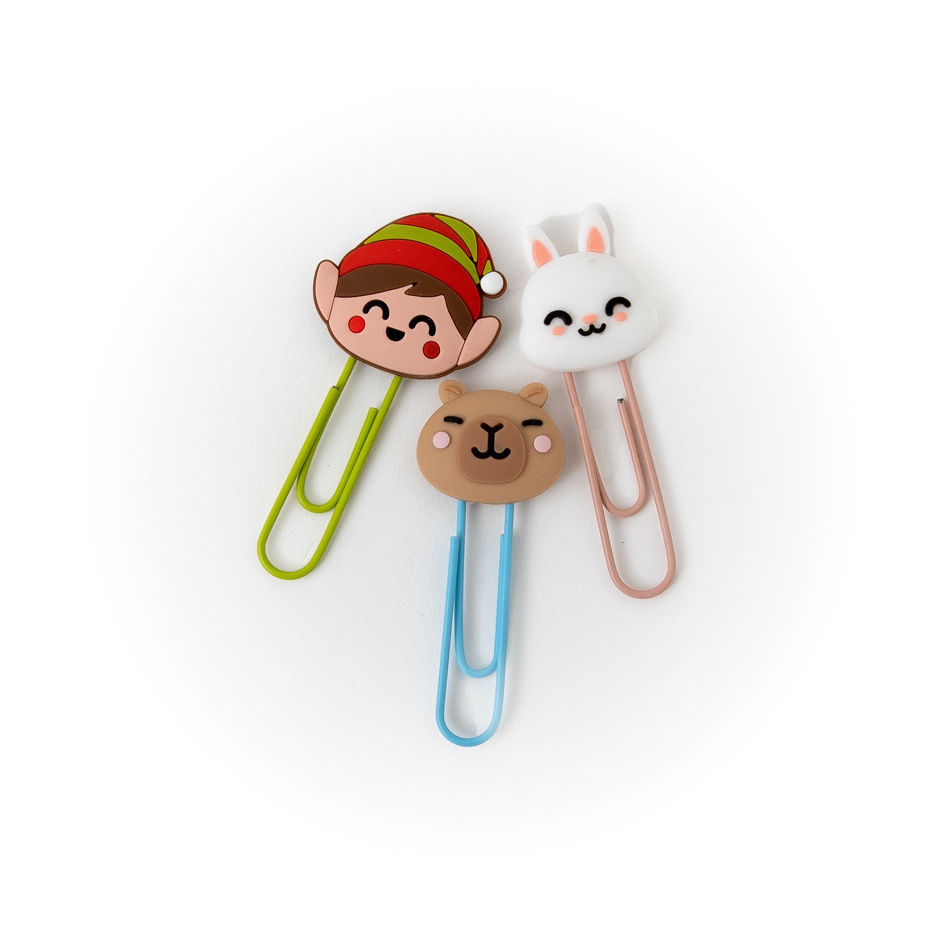 · 3 clips de papel con personajes (elfo, capibara y conejo)