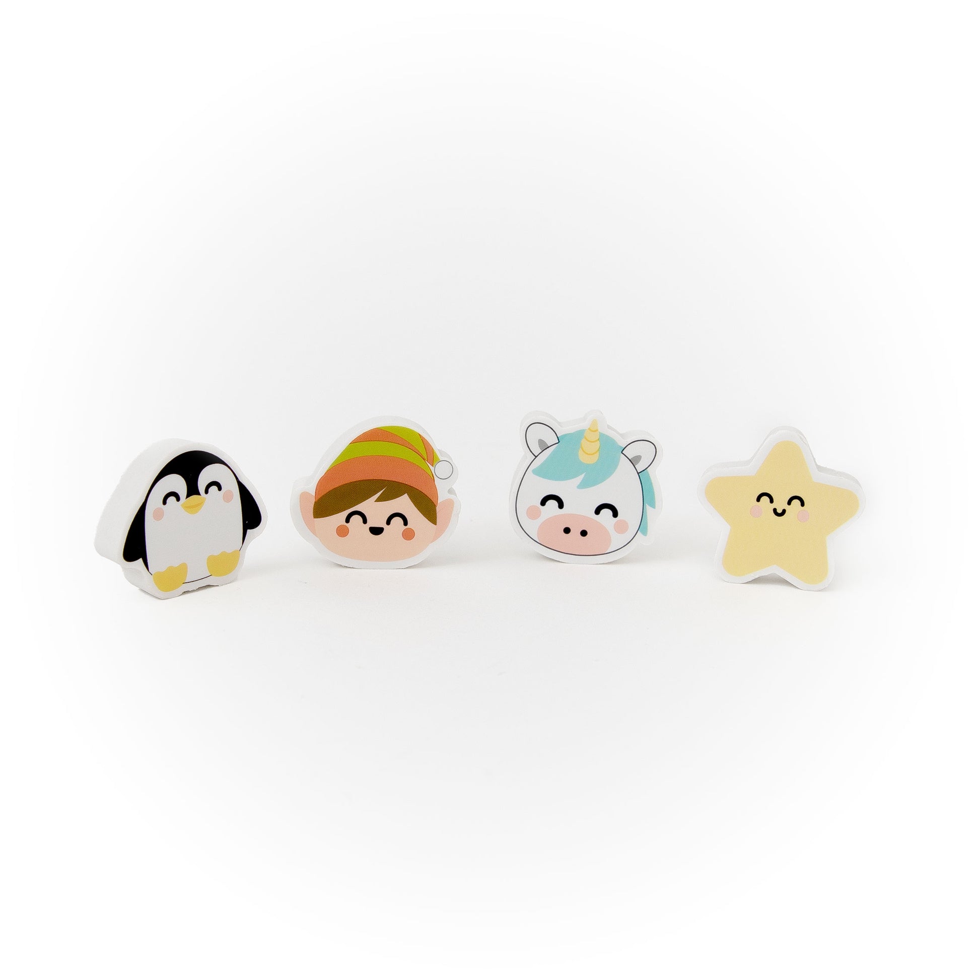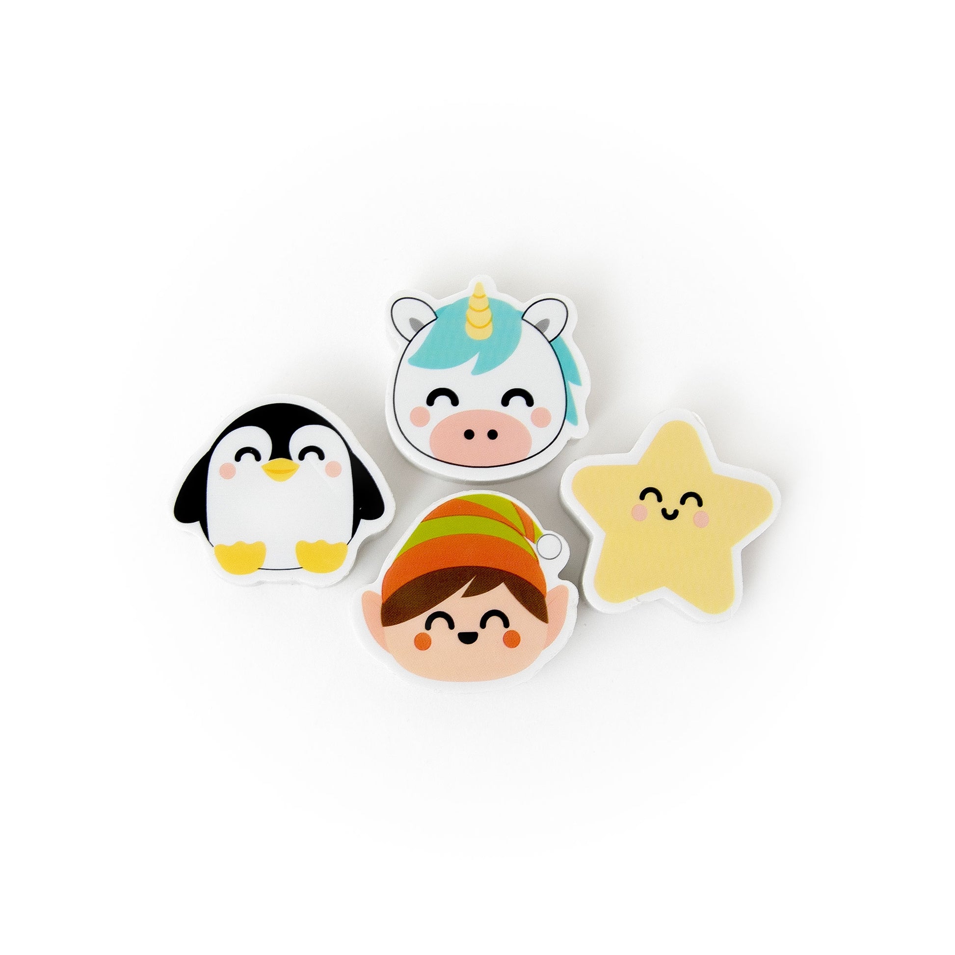 · 4 gomas de borrar con formitas (elfo, unicornio, pingüino y estrella)