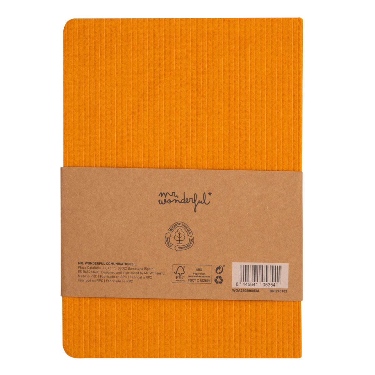 Libreta de tamaño A5 con portada forrada de pana. En su interior encontramos 160 páginas pautadas elaboradas con papel de 90gsm. Cuenta con el certificado FSC, que garantiza que ha sido fabricada utilizando papel proveniente de bosques gestionados de forma responsable.