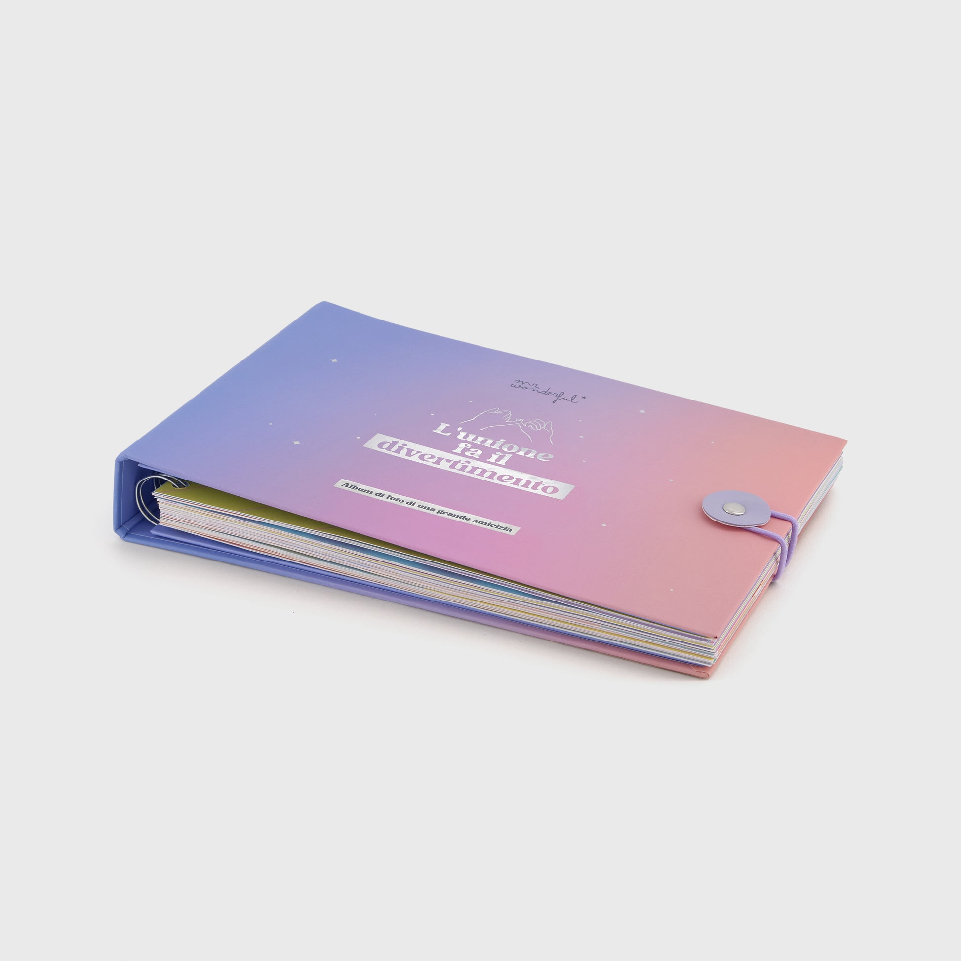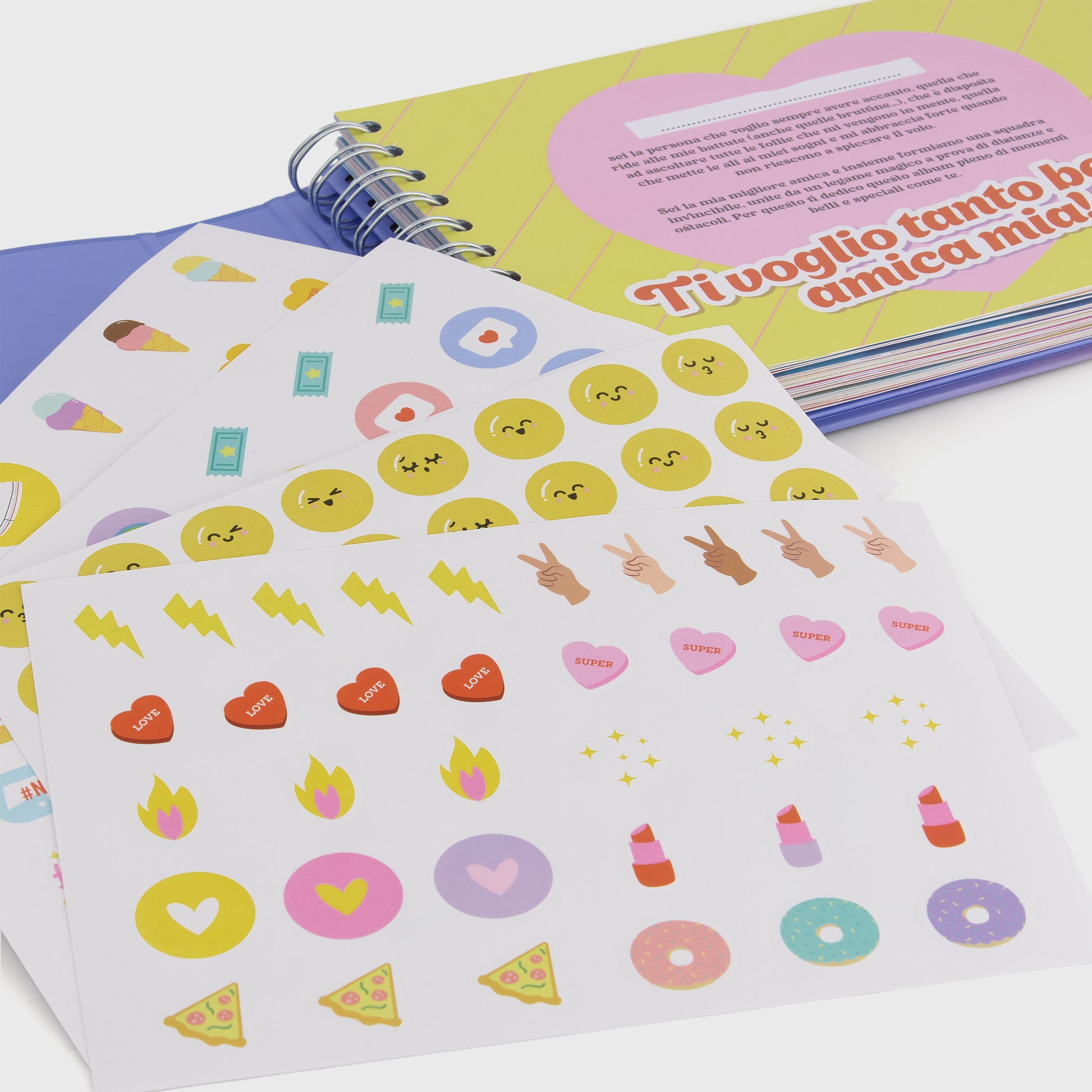 Album fotografico a tema amicizia, pensato per essere riempito e offerto come regalo a un'amica. Con 64 pagine (alcune con messaggi per accompagnare le foto o piccoli testi da completare), 8 fogli di adesivi per decorare e personalizzare l'album e una tasca interna per conservare ricordi e fogli sciolti. Inoltre, nella prima pagina c'è uno spazio per scrivere il nome della persona che riceverà il regalo, accompagnato da un bel testo di dedica.