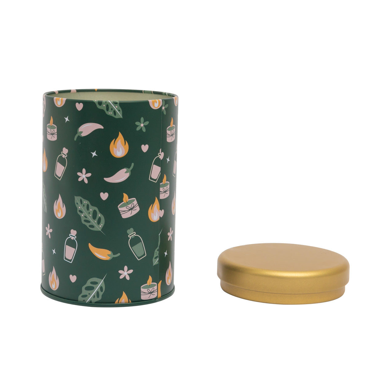 Bougie parfumée en cire végétale. Elle est présentée dans un petit pot métallique avec couvercle, sur lequel est inscrit le message de la bougie. Parfum : Spiced chestnut.