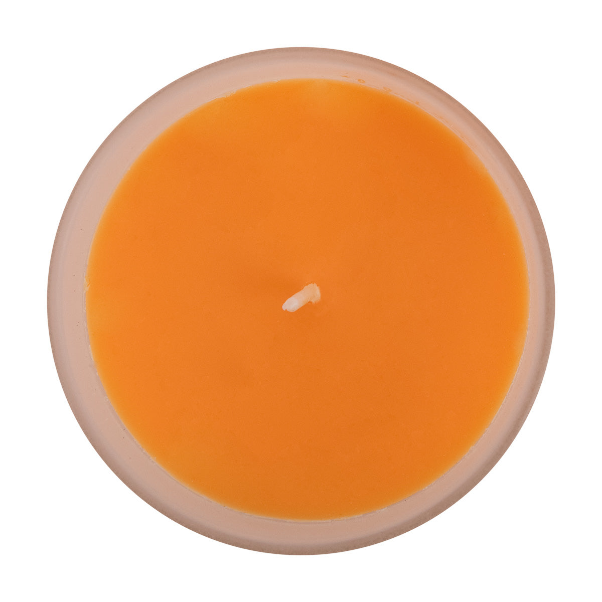 Bougie en cire végétale colorée, présentée dans un contenant en verre transparent. Parfum : ambre noir.