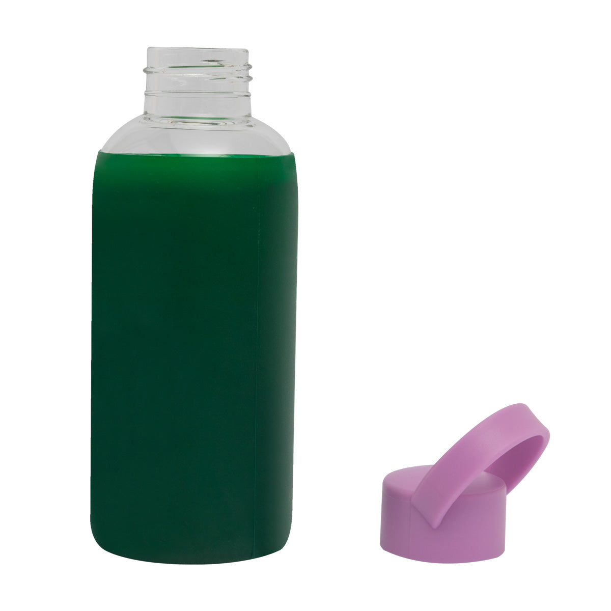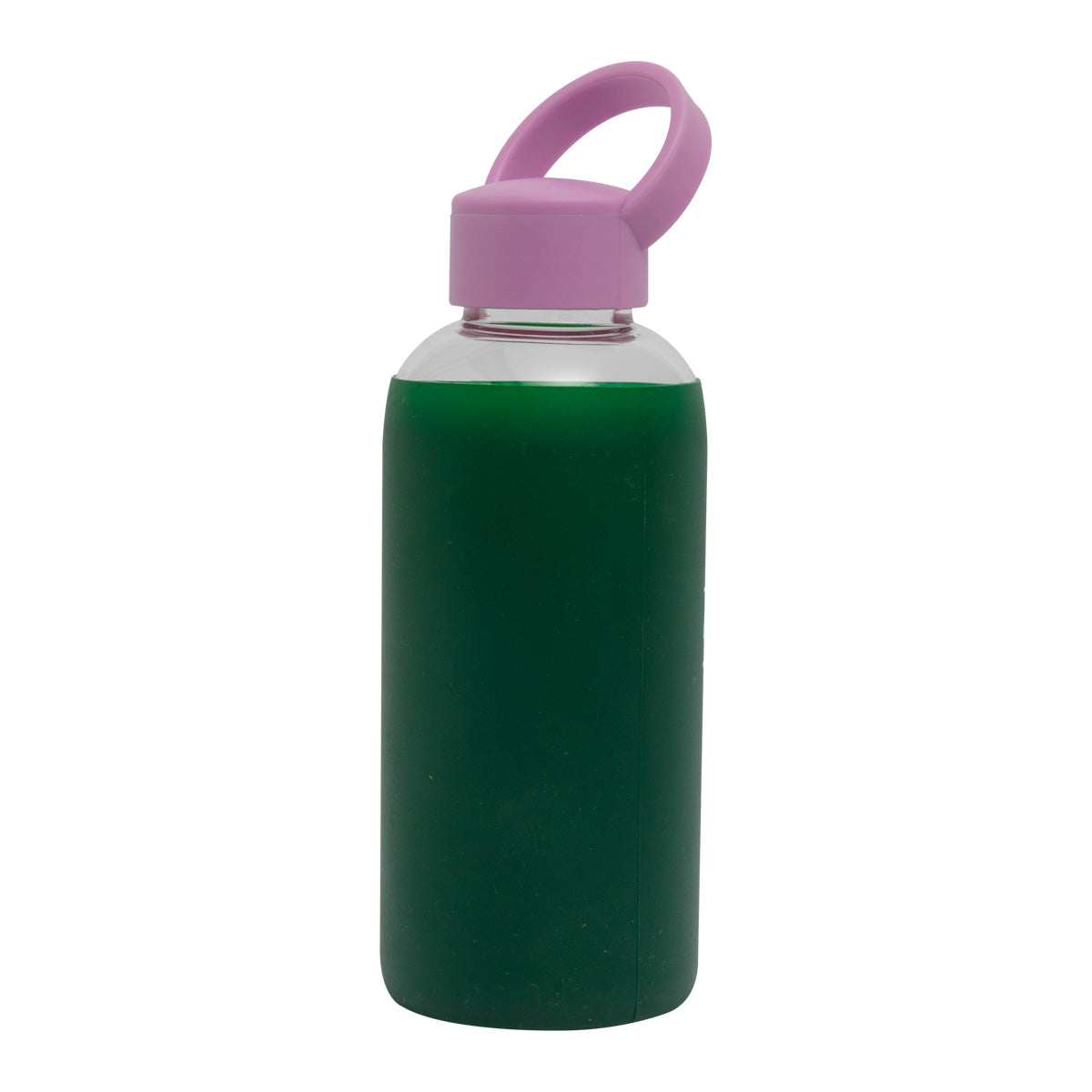 Bouteille en verre avec bouchon en plastique sans BPA et bande de silicone autour, avec un message amusant en français. La bande de silicone empêche la bouteille de glisser et facilite sa prise en main.