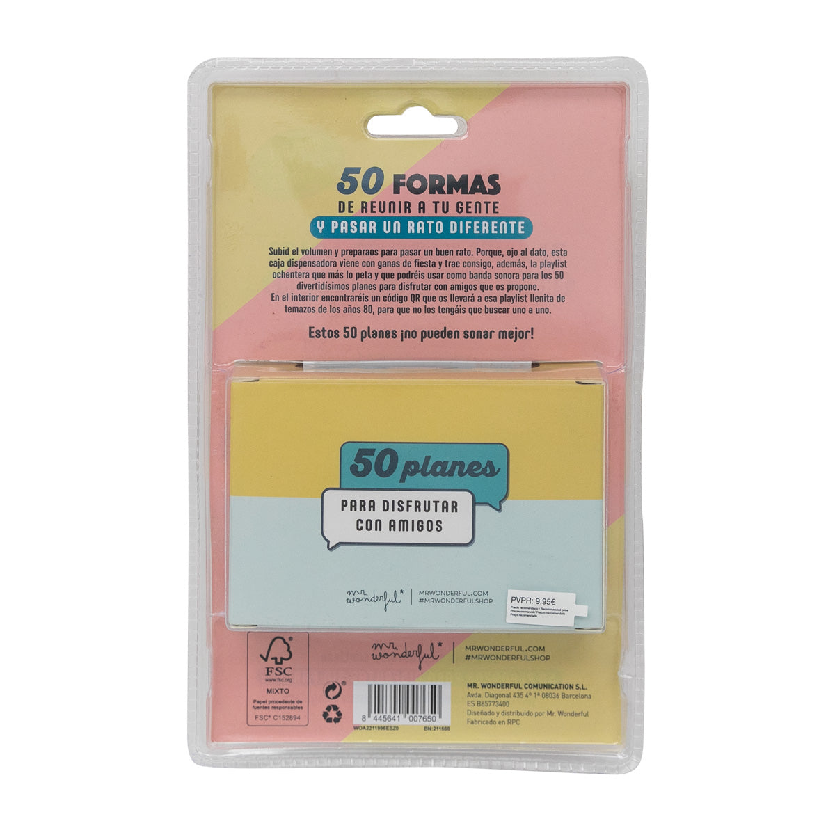 Según los datos recopilados por Mr. Wonderful, “¿Qué hacemos hoy?” es la pregunta que más se repite entre los grupos de amigos. Por eso te traemos la solución que acabará con todos esos dolores de cabeza; no es un móvil, pero sí que hace una llamada a la diversión. E s una caja dispensadora de planes para disfrutar con amigos, perfecta para llenar vuestra memoria de momentos inolvidables. La caja tiene un diseño de radiocasette clásico que representa el buen ro llo de la temática ochentera y resulta de lo más atractivo.