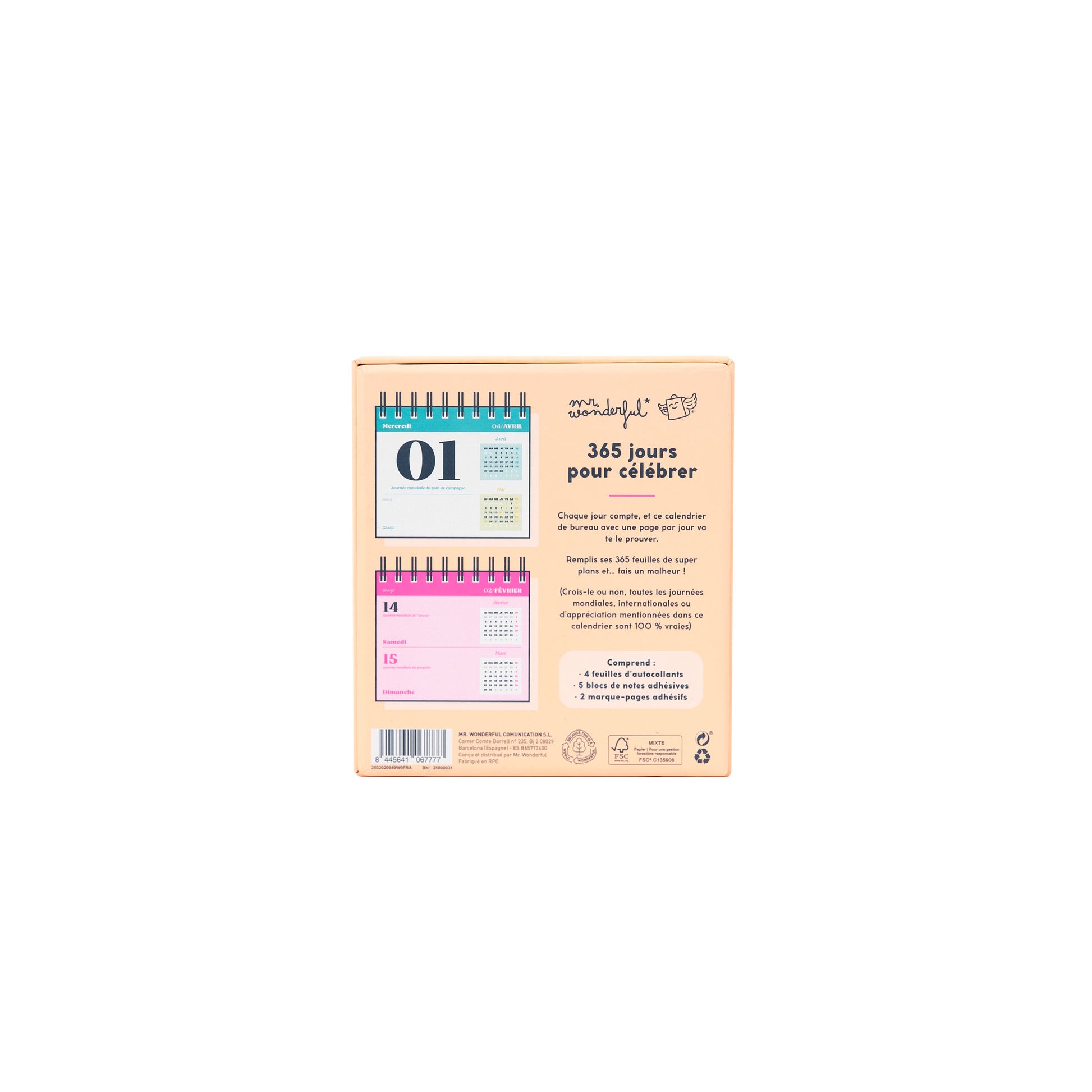 Calendrier de bureau avec une page par jour pour toute l’année, conçu de manière à ce que les 6 premiers mois soient dans un sens, puis, une fois arrivé à la moitié, il suffit de le retourner pour voir les 6 mois suivants. Chaque jour, découvre une journée mondiale, internationale ou d’appréciation surprenante.