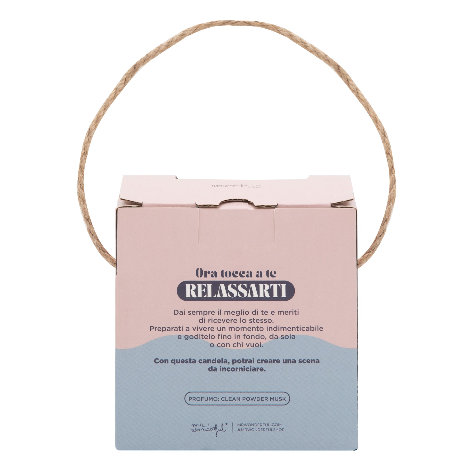 Candela realizzata con cera vegetale in un contenitore di vetro con coperchio. Il messaggio è stampato su un'etichetta. Le sue grandi dimensioni consentono di utilizzarla più a lungo. Profumo della candela: Clean powder musk.