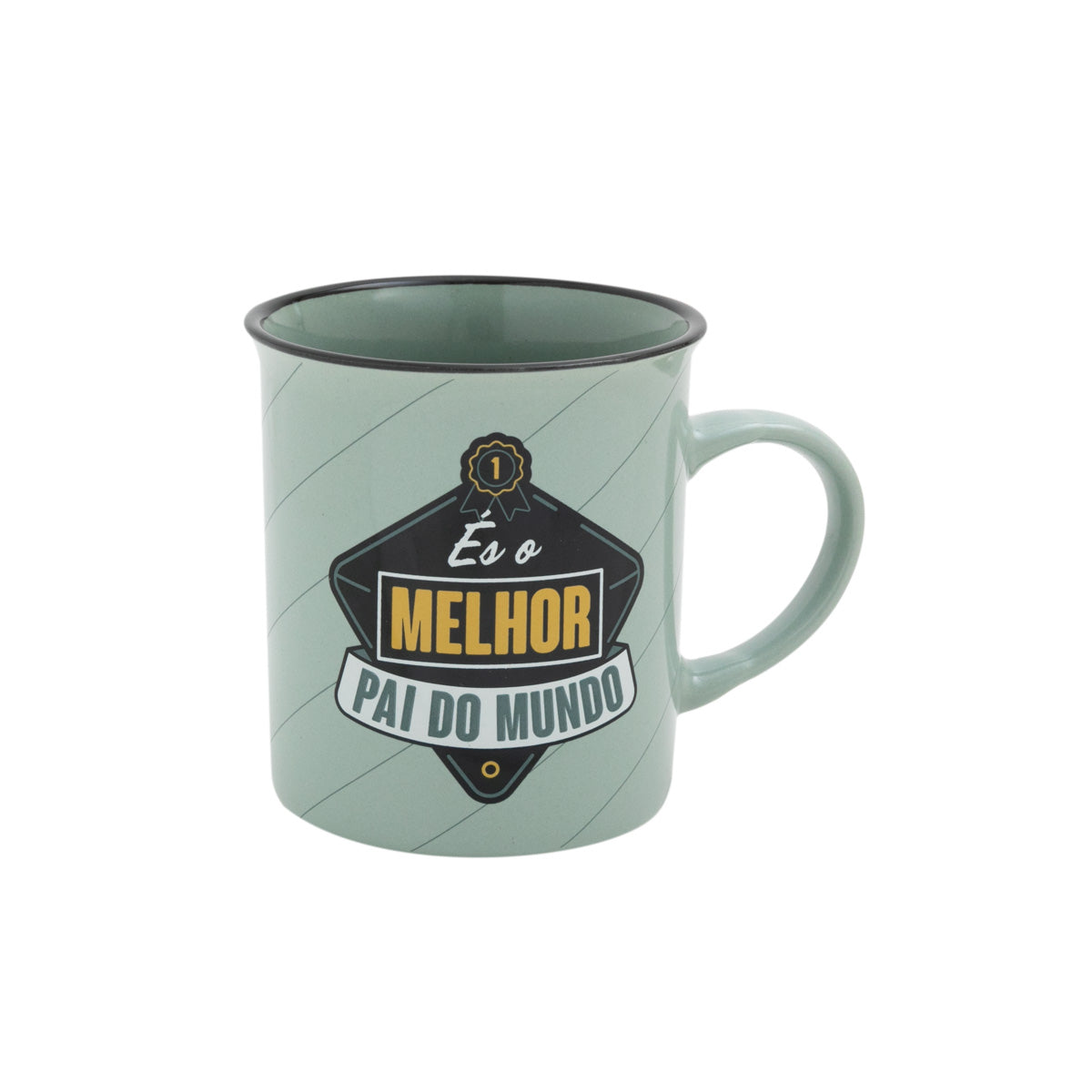 - Caneca fabricada em cerâmica com mensagem dirigida a pais.