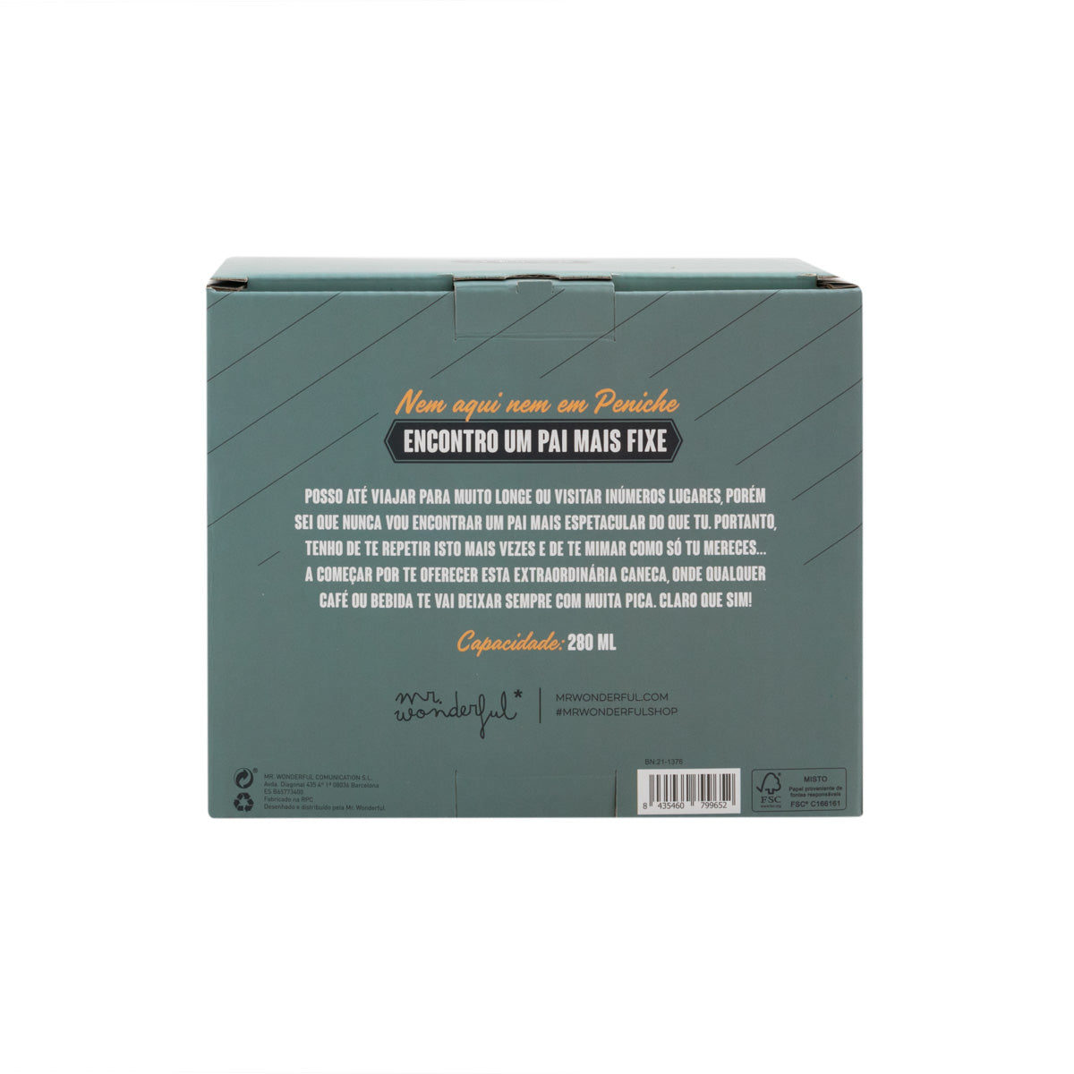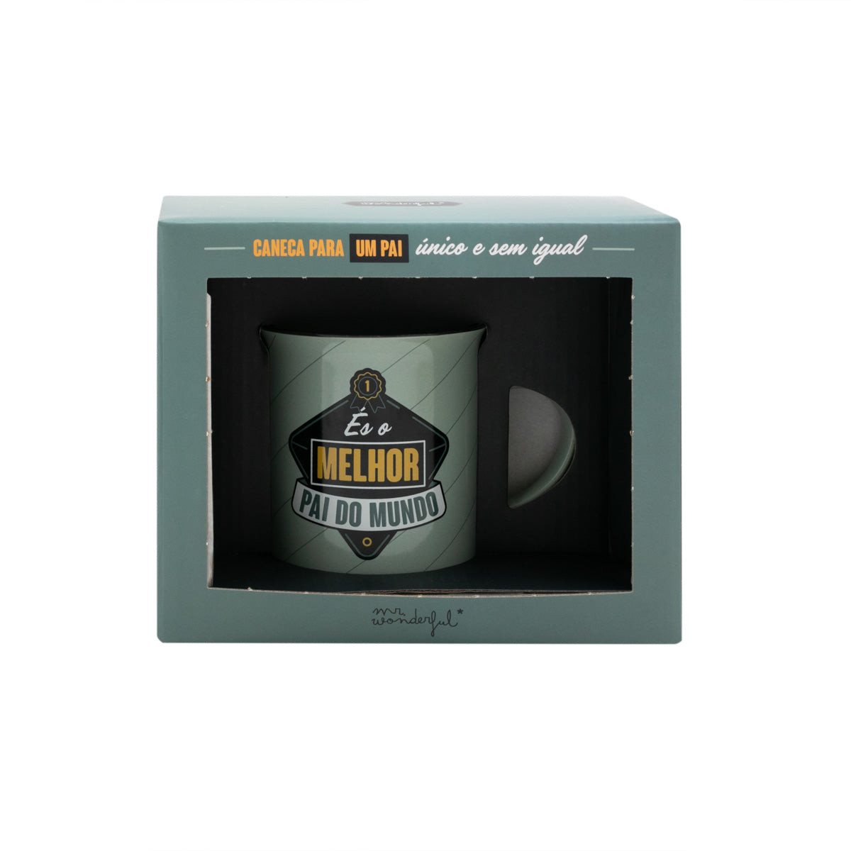 Quantas vezes já disseste ao teu pai que era espetacular? De certeza q ue umas quantas, mas... serão suficientes? Na Mr. Wonderful pensamos que não, porque nunca é demais apresentar uma boa dose de amor do bom e do melhor e carinho sincero. Por isso, a nossa coleção d e presentes para pais de todos os tipos e idades inclui sempre mensagens emotivas e divertidas para voltar a dizer-lho mil e uma vezes. Assim, nesta coleção nunca pode faltar o clássico entre os clássicos... Sim, adivinhaste: referimo-nos a uma das nossas fantásticas canecas com men sagem. Neste caso, uma caneca Mr. Wonderful fabricada em cerâmica e que contém uma capacidade de 280 ml para ele poder saborear pequenos-almoços, lanches e tudo o que o teu pai quiser e sempre, semp re à sua maneira. Além disso, é apta tanto para aquecer no micro-ondas como para ser lavada na máqui na da louça e está decorada com uma bonita frase que diz “És o melhor pai do mundo”. Claro que sim ! E, para completar este superpresente, colocámos um surpresinha na sua caixa: um espaço na par te traseira onde encontrarás um texto personalizável que poderás preencher para o dedicares ao teu pai. Genial, não achas? Então não fiques sem a tua caneca do Dia do Pai!