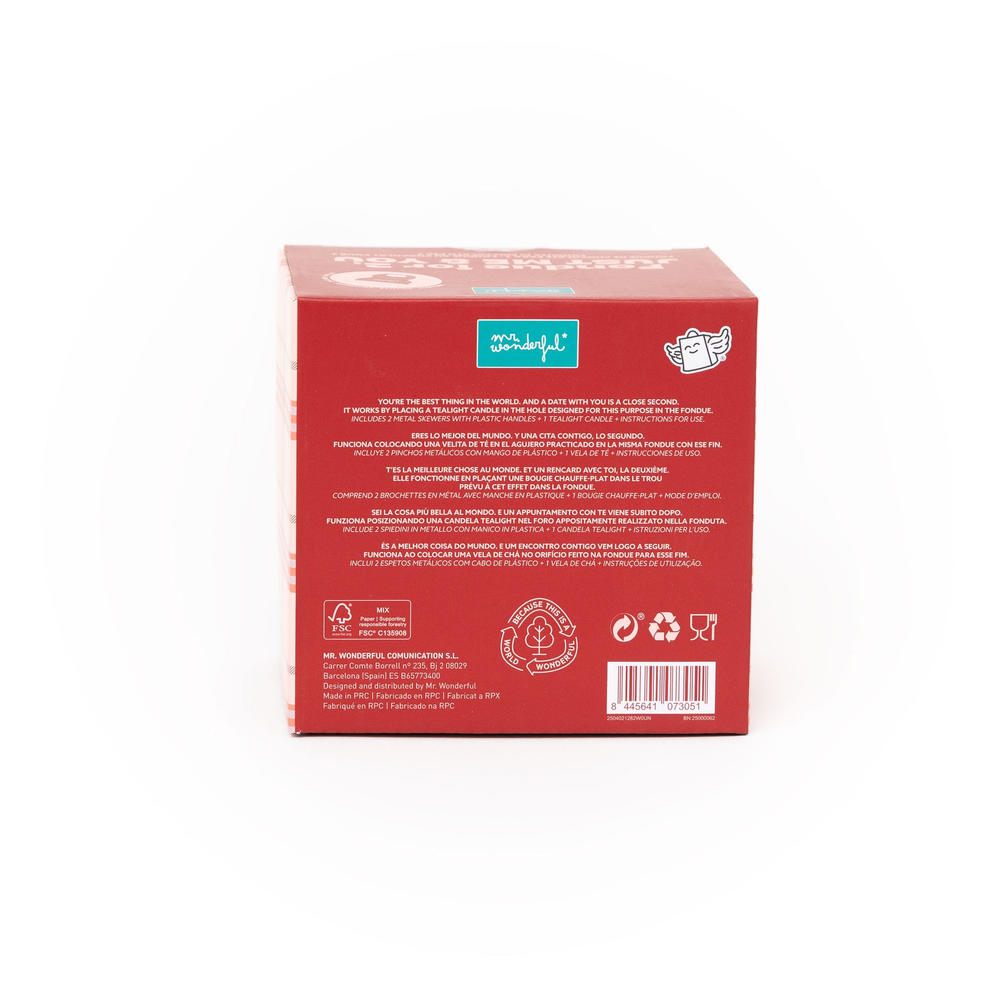 Set para disfrutar de una deliciosa fondue de chocolate para dos personas. Incluye una fondue de dolomita de 20 cl de capacidad, en la que fundir el chocolate, colocando una velita de té en el agujero practicado en la misma fondue con ese fin. Asimismo, incluye también una velita de té de cera de parafina en carcasa metálica y dos pinchos de acero inoxidable de 12 cm de largo, con mango de plástico, ideales para pinchar y sumergir en el chocolate las piezas de fruta, bollería o lo que se desee.