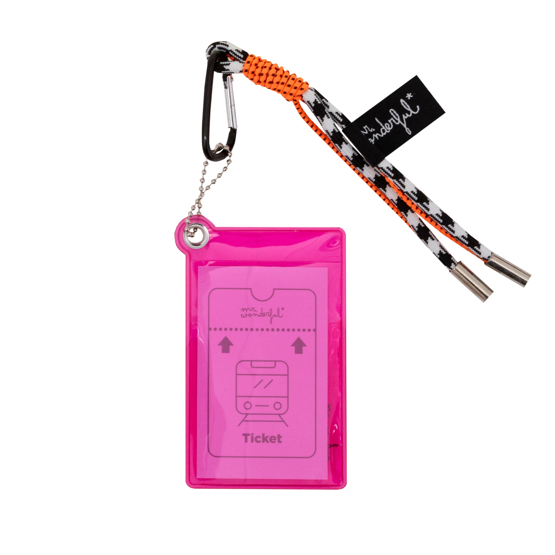 Funda de plástico transparente en color fucsia, ideal para llevar en ella los títulos de transporte y otras tarjetas. Cuenta con un divertido enganche en forma de mosquetón, perfecto para colgarlo de la mochila, por ejemplo, y tenerlo siempre a mano. Como accesorio decorativo, incorpora un moderno cordón grueso que hace un gran nudo, lo que le confiere originalidad.