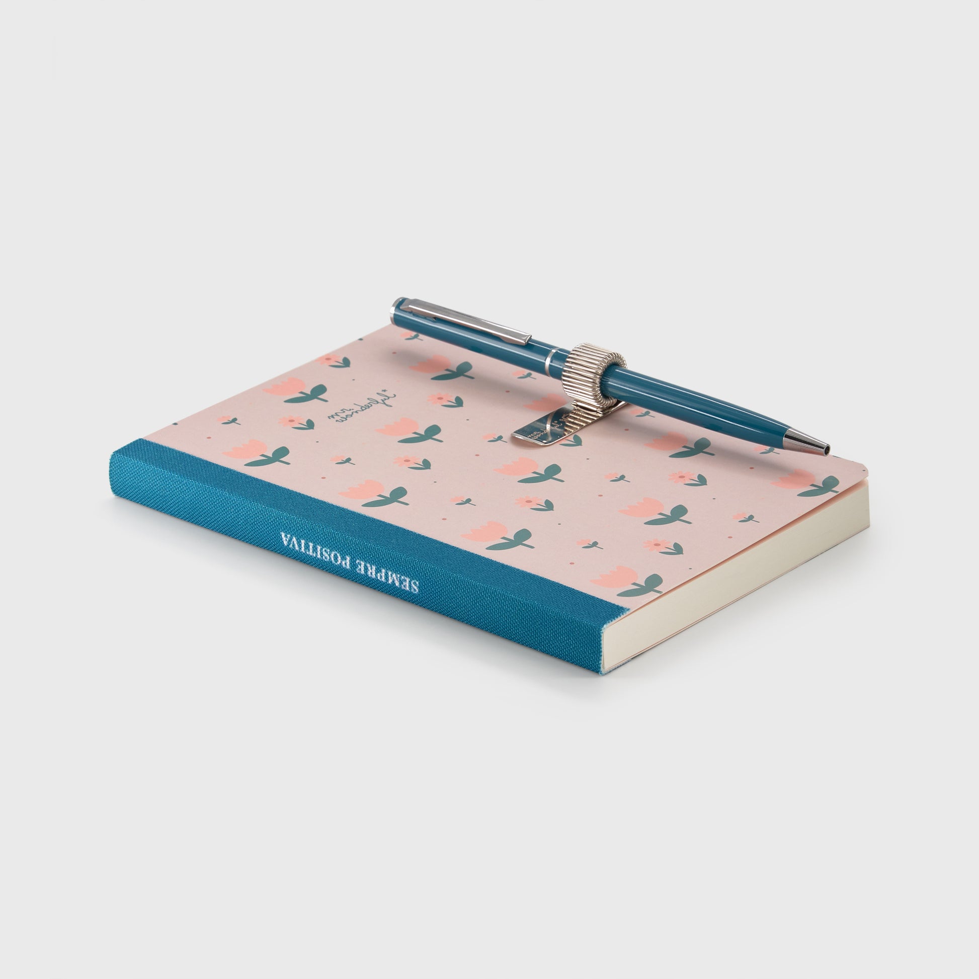 · Caneta metálica com clipe para a prender ao caderno, tinta azul.