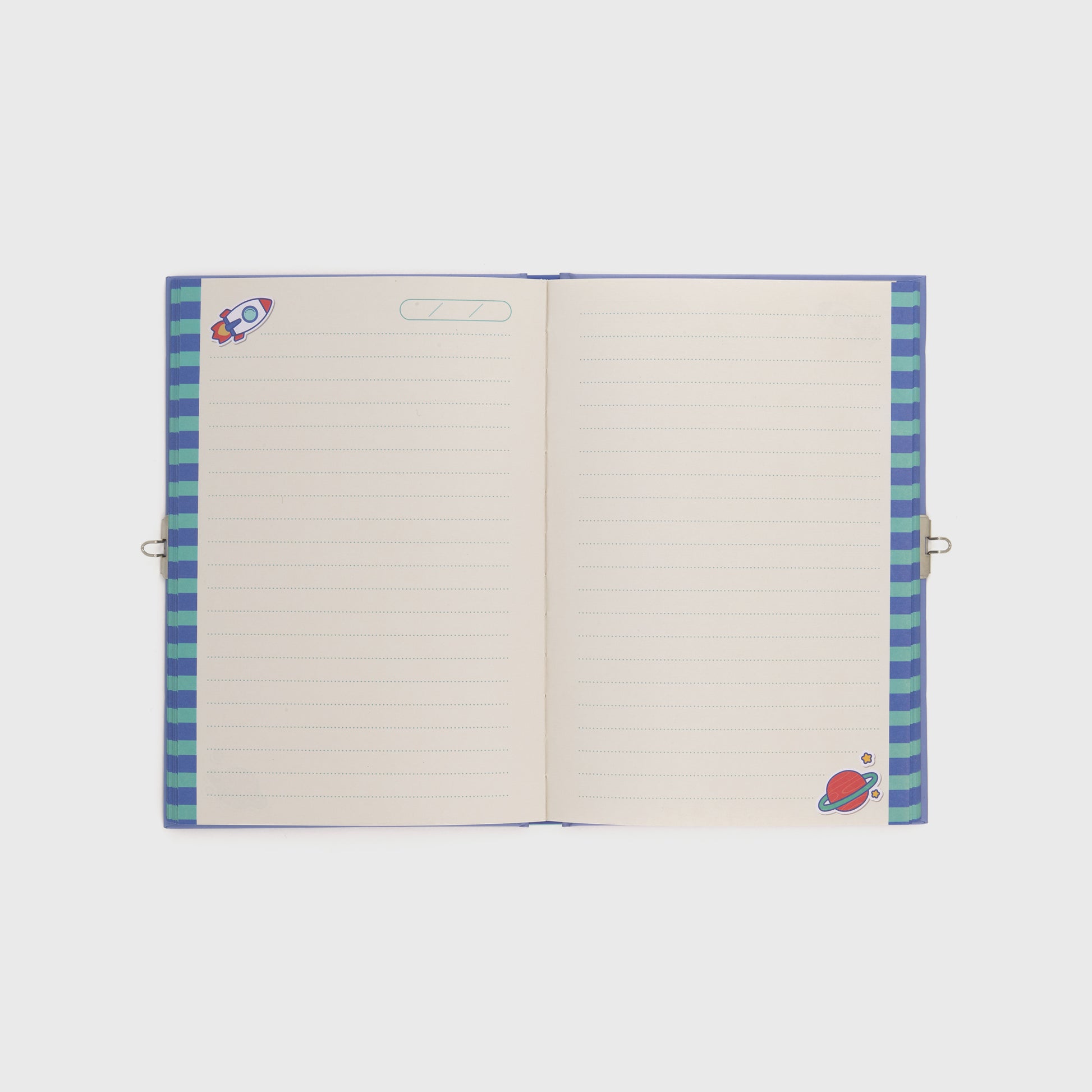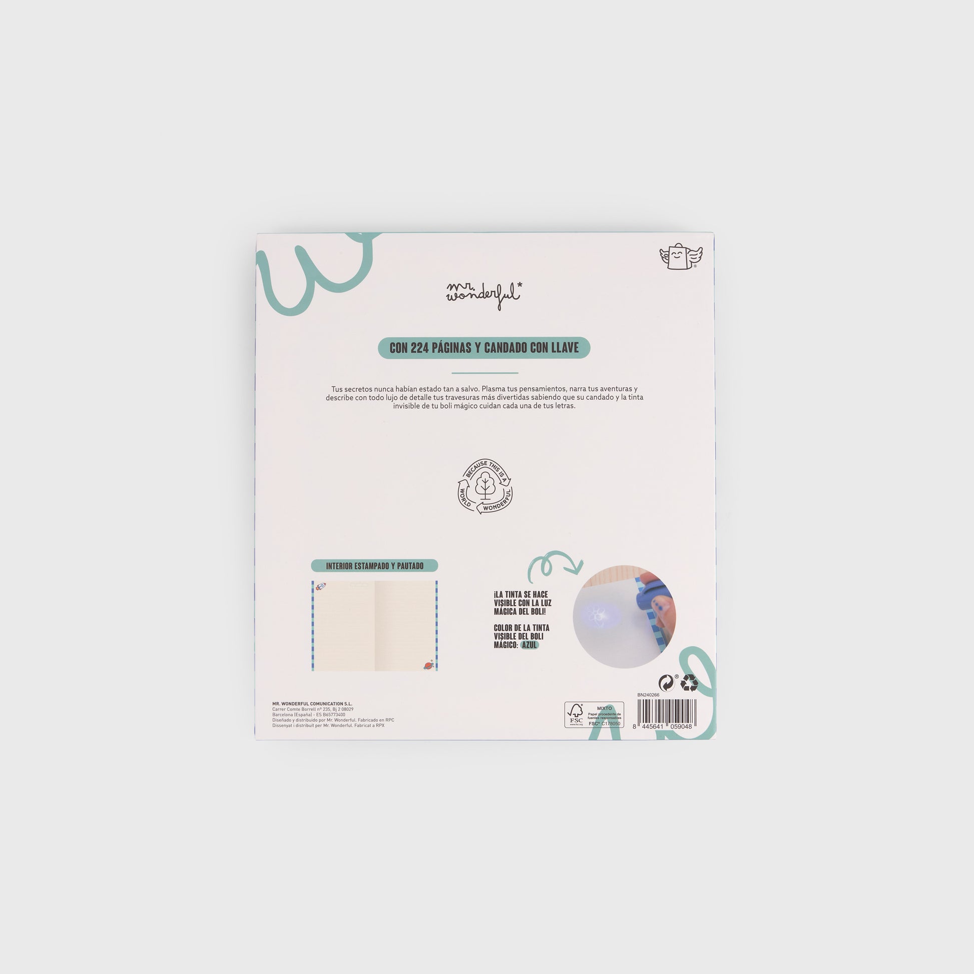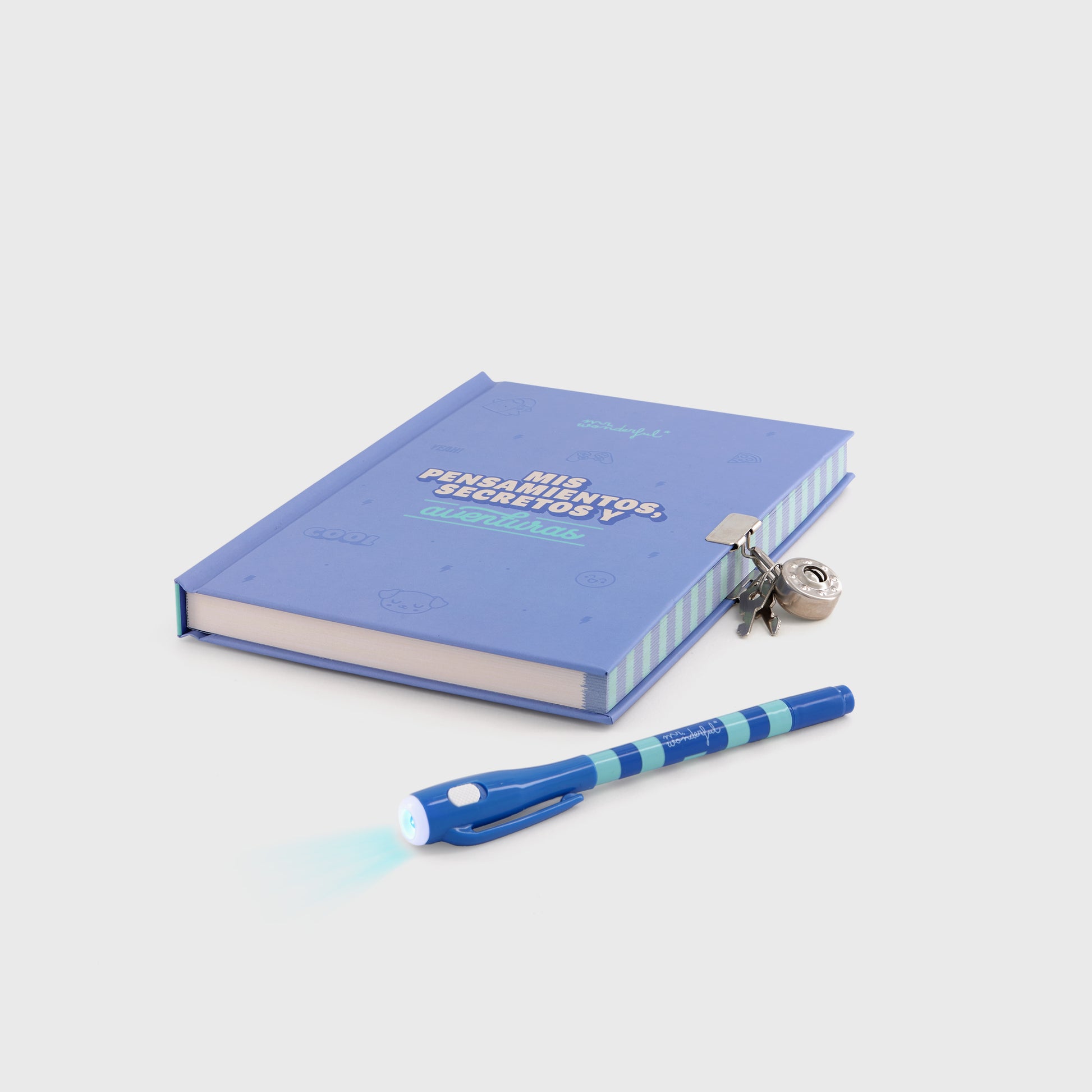 Diario personal con 224 páginas pautadas y estampadas y cierre de candado con llave (se adjunta llave de repuesto). Además, incluye un bolígrafo con tinta normal de color azul, por un lado, y con tinta "mágica" por el otro: la tinta resulta invisible a la vista hasta que se ilumina con la luz que lleva incorporada el mismo bolígrafo.