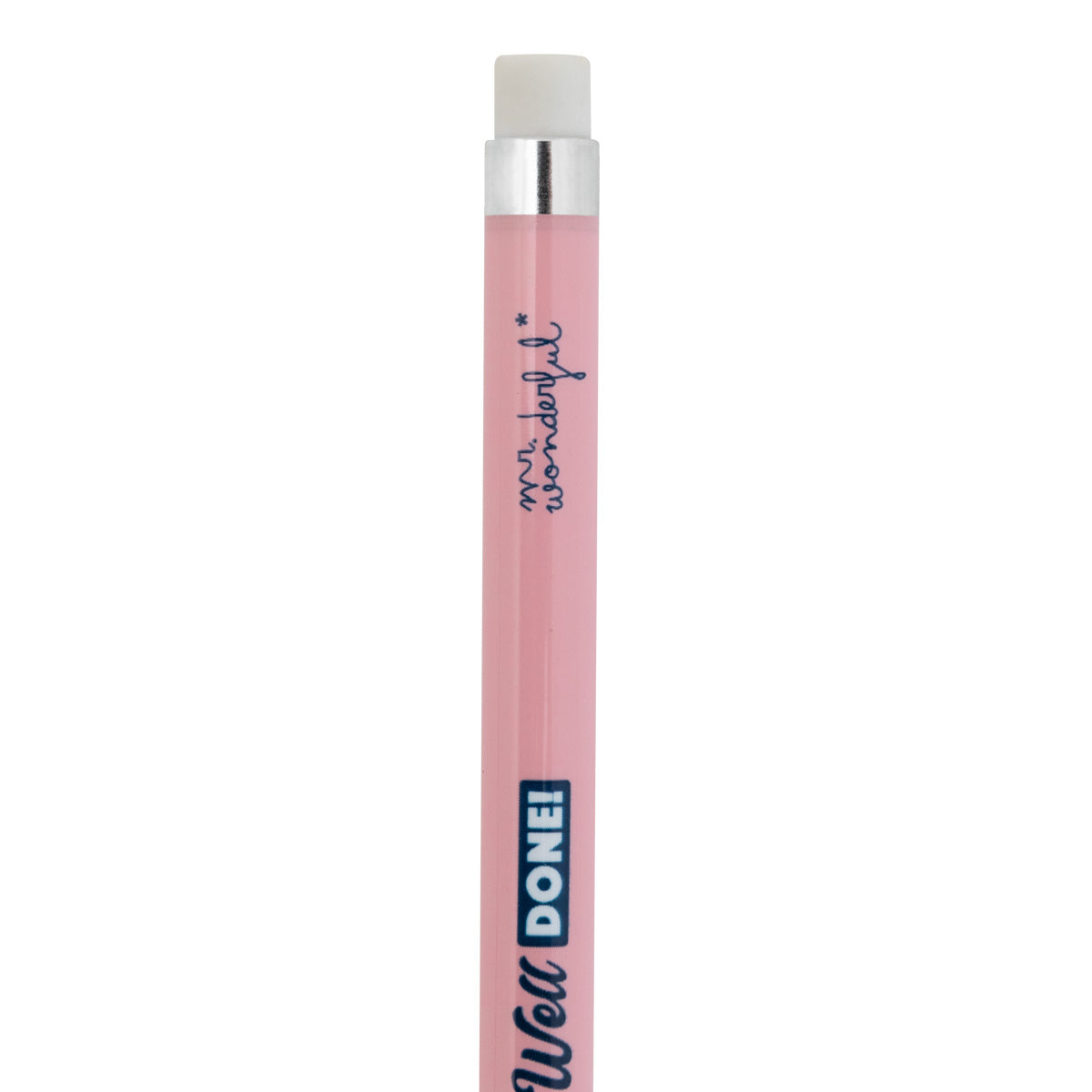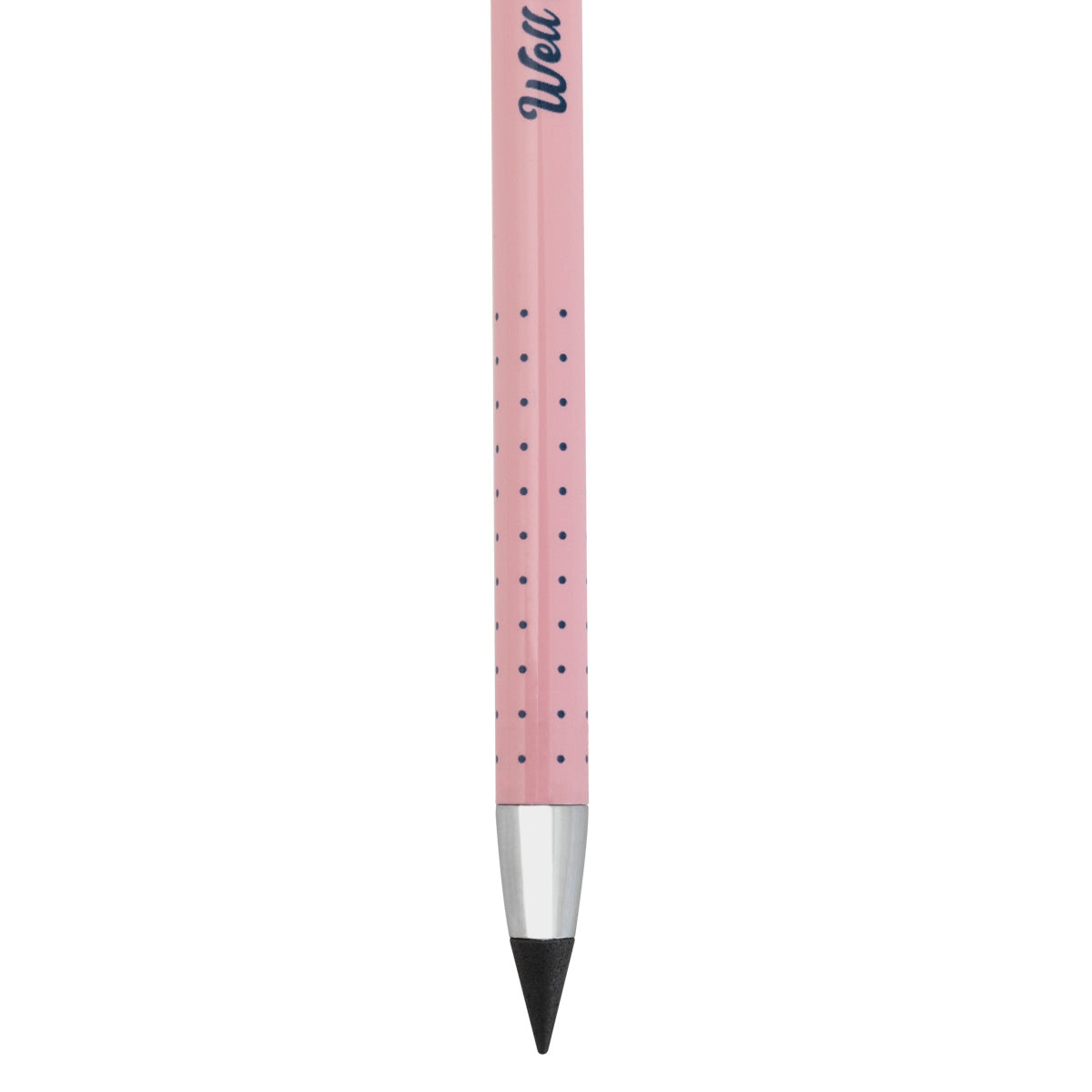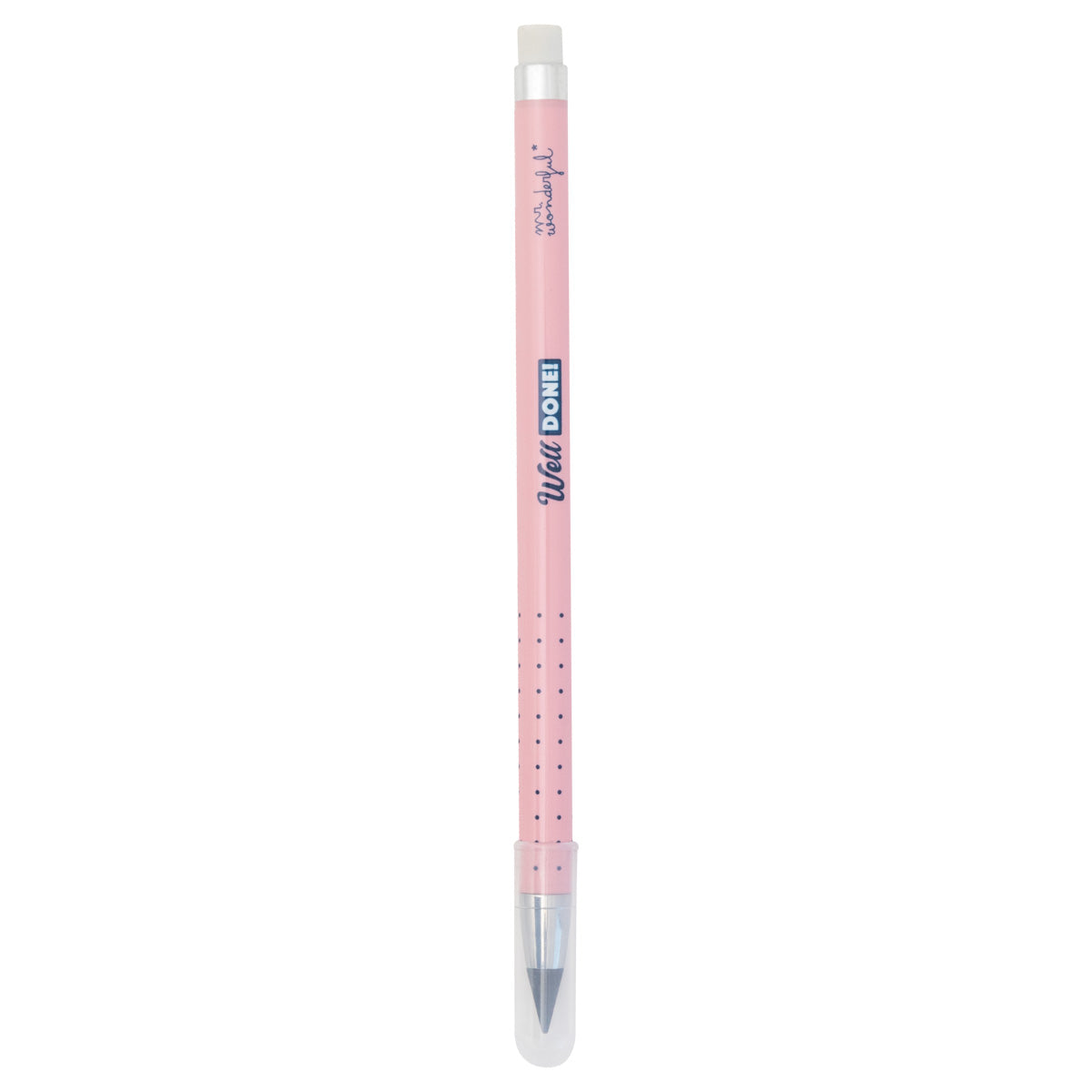 Lápiz infinito con mensaje "Well done!". Su punta no está fabricada en grafito, sino que se trata de una aleación de estaño y bismuto que logra que no sea necesario afilarla, que no manche, que no se emborrone al escribir y que, a pesar de ello, se pueda borrar con normalidad.
