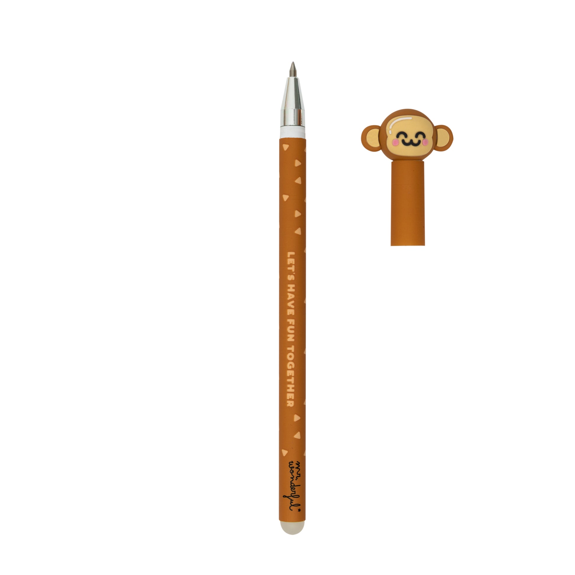 Boli con tinta borrable de color azul y el mono Bono en uno de sus extremos.