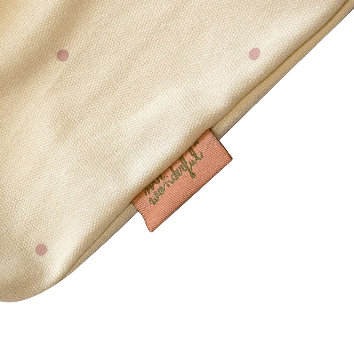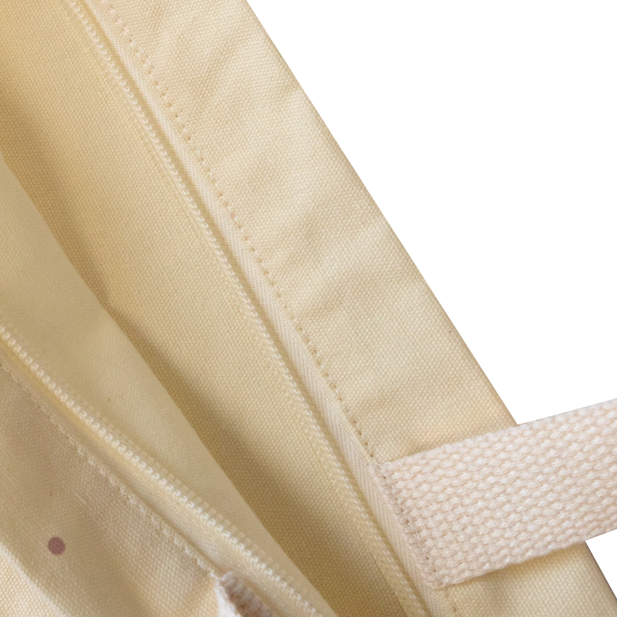 Bolsa de tela estilo tote bag, realizada en algodón, con asas para colgar y un bolsillo interior con cierre de cremallera.