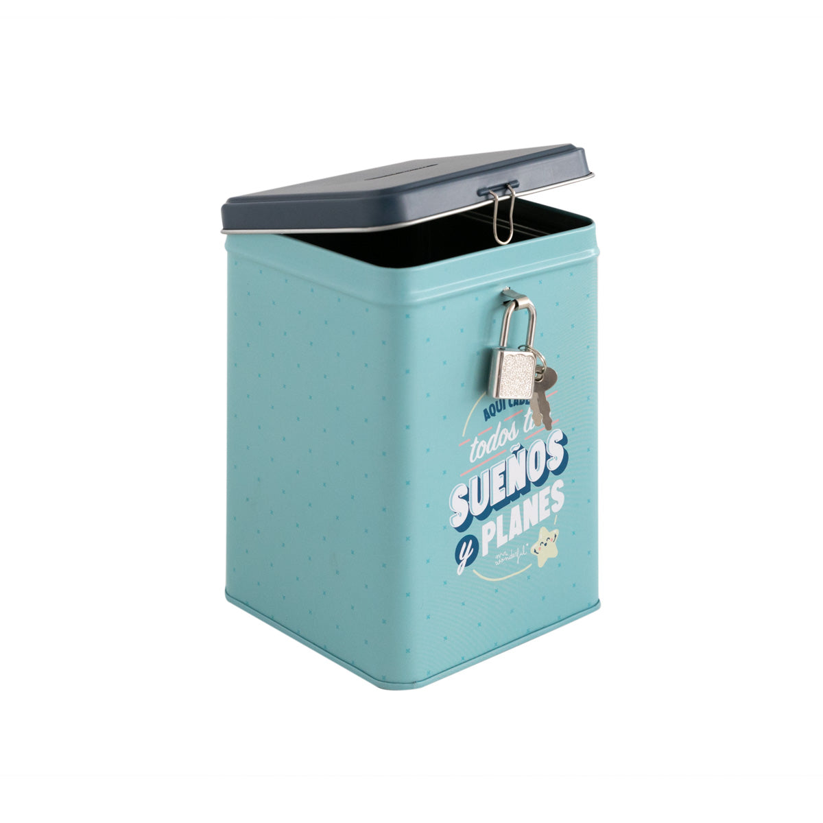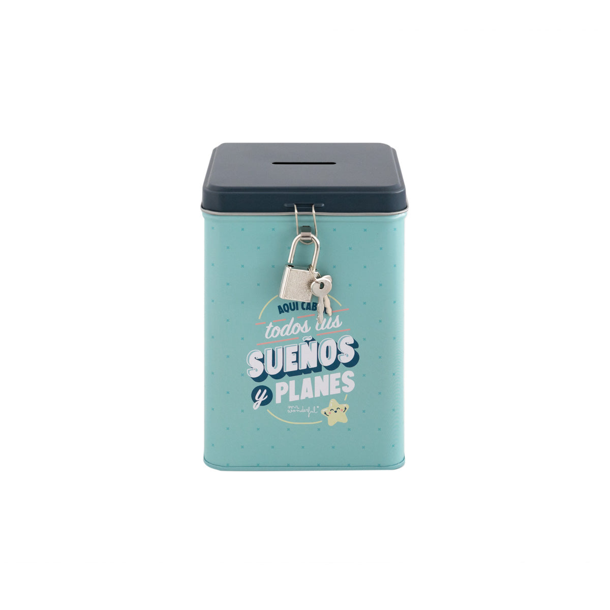 En esta preciosa hucha de Mr. Wonderful cabe tu sueño de aprender a to car la guitarra, cabe tu ilusión de montar en las atracciones de la feria o las ganas que tiene s de pasarlo bien con tus amigos en el cine. Sabemos que todo esfuerzo conlleva su recompensa y por eso te apoyamos para que logres alcanzar muchos de tus sueños con esta hucha. Su forma es cuadr ada y es de aluminio, tiene un diseño muy wonder, para que la puedas usar como decoración en tu ha bitación, en tu escritorio o en algún lugar secreto, ¡tú eliges!