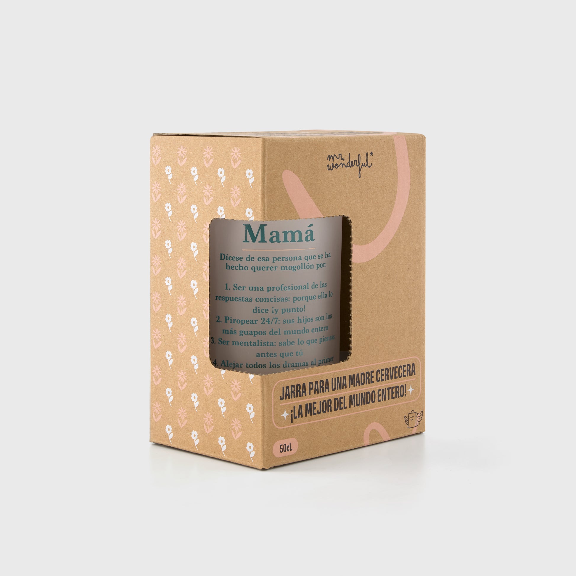 Jarra de cerveza de diseño clásico, realizada en vidrio. Cuenta con un mensaje impreso que resulta ser una "definición" de mamá en tono divertido, lo que la convierte en un artículo ideal para regalar.