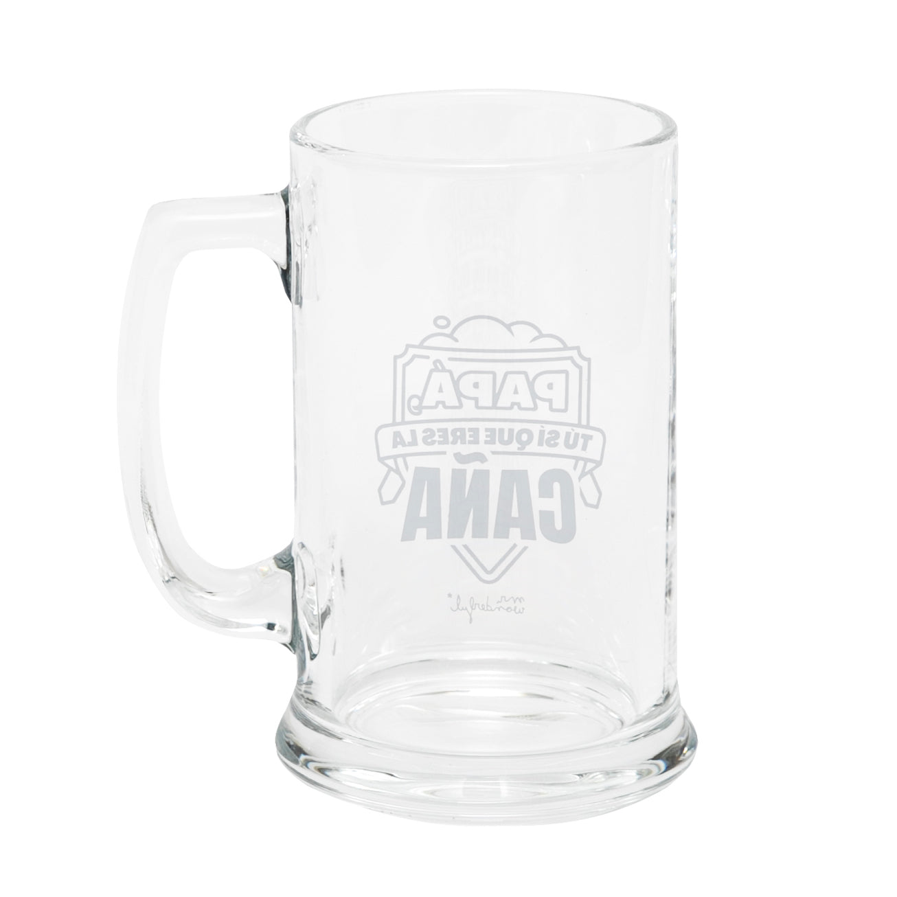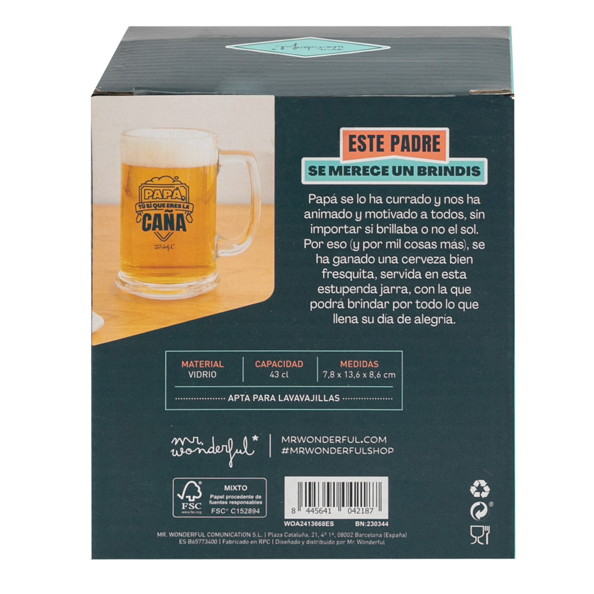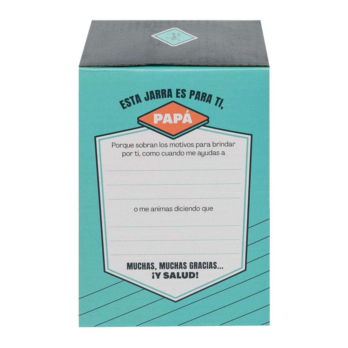 Jarra de cerveza realizada en vidrio, con mensaje dirigido a padres. Capacidad: 430 ml. En la parte trasera del pack encontramos un textito rellenable para configurar un mensaje bonito dedicado a papá, aumentando así la experiencia regalo.