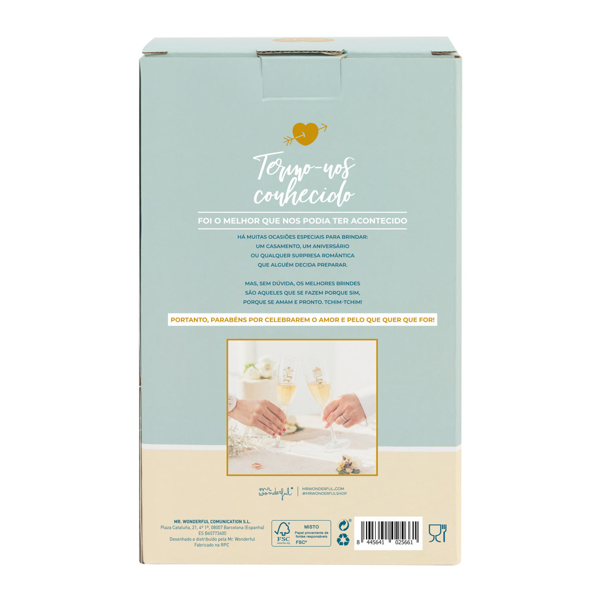 Kit de dois copos para champanhe, com uma mensagem de amor dividida entre ambos. É ideal como presente para os noivos.