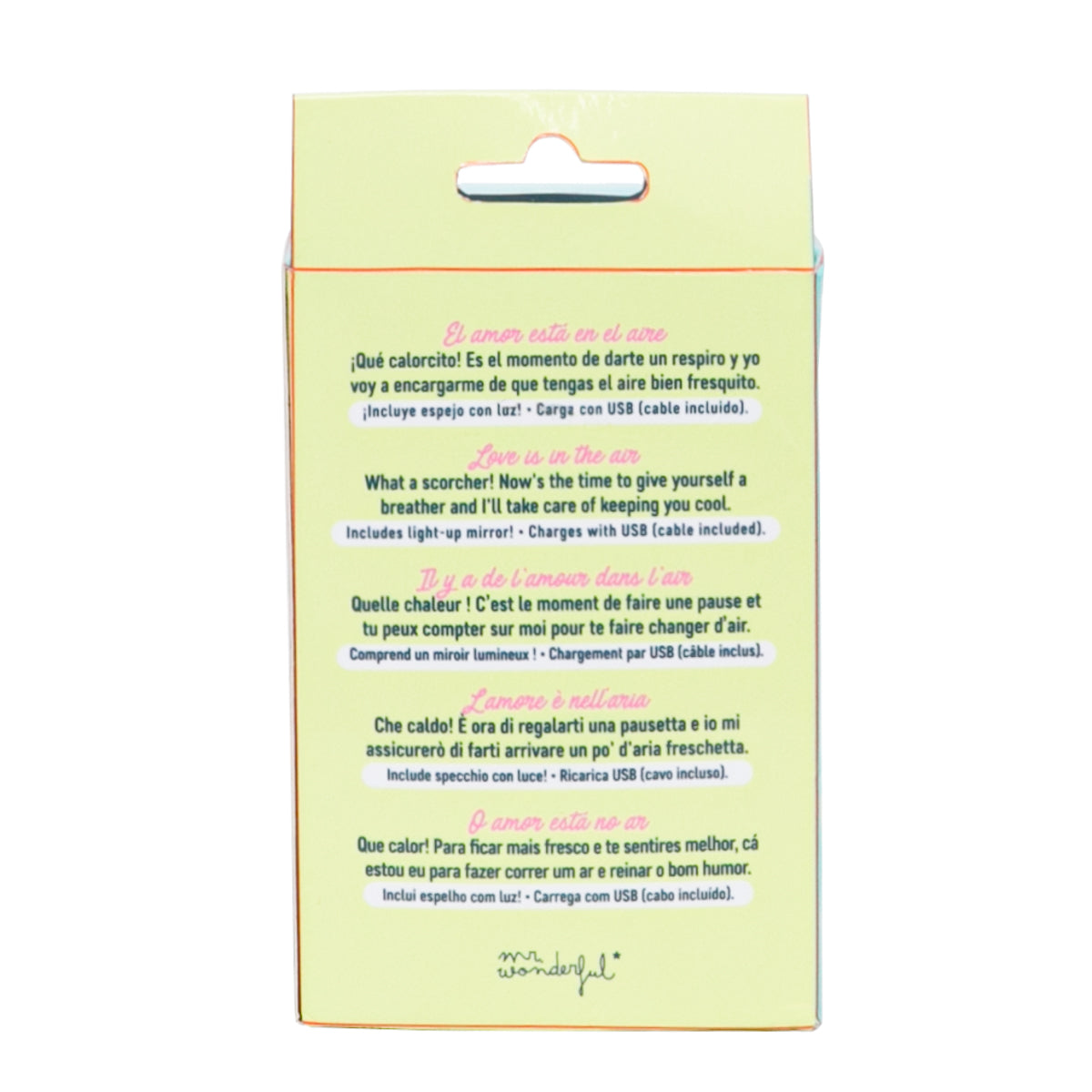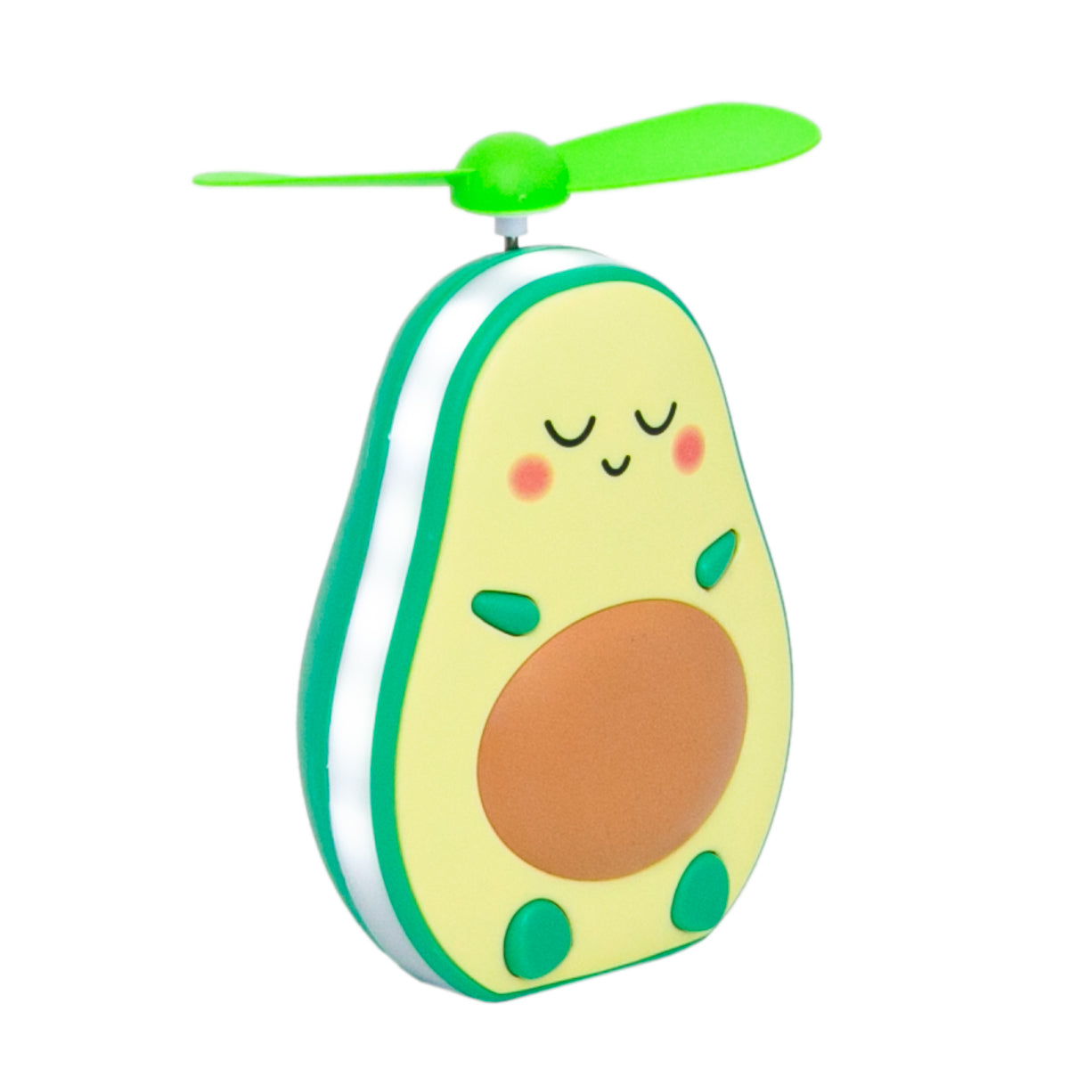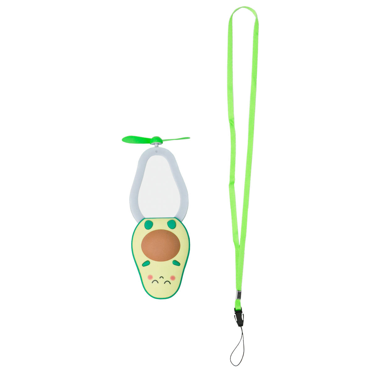 Miniventilador portátil con forma de aguacate wonder. Cuenta con un sistema de apertura central que deja a la vista un pequeño espejo que se ilumina alrededor. Carga con cable USB (incluido).