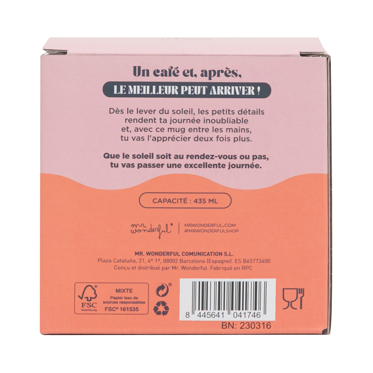 Mug fabriqué en verre, entièrement estampé et avec un message amusant en français, ce qui le rend idéal à offrir en cadeau ou pour l’autoconsommation. La poignée a une forme ondulée et ergonomique, ce qui, en plus d’un grand confort d’utilisation, apporte une touche d’originalité.
