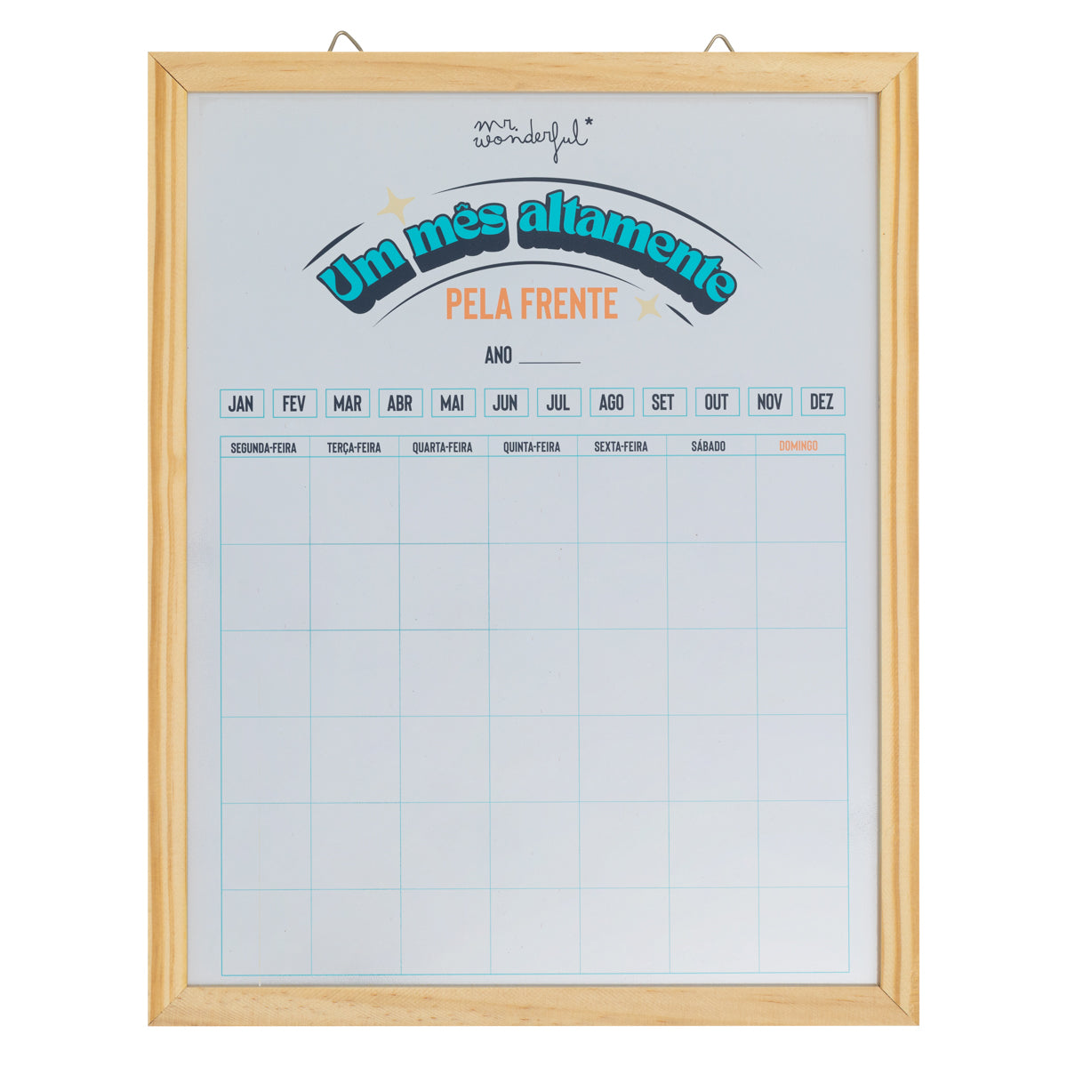 Organizador mensal com moldura de madeira, ideal para pendurar na parede e ver os planos e tarefas do mês de relance. Possui uma superfície de quadro branco e vem com dois marcadores apagáveis de tinta preta, permitindo uso indefinido. Inclui 10 ímanes que aderem à superfície e podem ser usados para destacar dias ou planos específicos.
