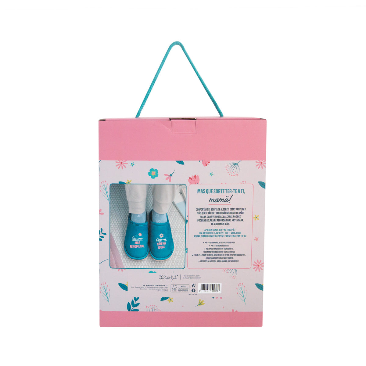 Acabas de ler a mensagem destas pantufas e veio-te a imagem da tua mãe supersorridente, com elas bem calçadinhas nos pés. Não foi? Mas que grande coincidência! Estás a perguntar-te a que se deve isso. Queres saber porque é isso aconteceu? A explicação é muito simples. Acontece que na Mr. Wonderful precisávamos de nos inspirarmos numa mãe muito especial e, depois de muito procurarmos, selecionámos a candidata que nos pareceu mais maravilhosa. Claro que sim! Desenhámo-las, com todo o nosso carinho, a pensarmos nela. Esse jeitinho que a tua mãe tem não se encontra nem nas melhores cozinhas dos grandes chefs, e estas pantufas com mensagem para mães, fabricadas em algodão e com sola de PVC, antiderrapantes, fofinhas e muito confortáveis, vão conquistá-la assim que as calçar. Que bem que a conhecemos e sabemos os seus gostos! Ela vai adorar mostrar as suas pantufas divinais. Ainda bem que a sola é antiderrapante, porque quando apanha balanço para ir de um lado para o outro, não há quem a agarre! Agora só tens que escolher o número adequado para lhes preparares esta surpresa e toca a levar alegria aos pés da mamã!