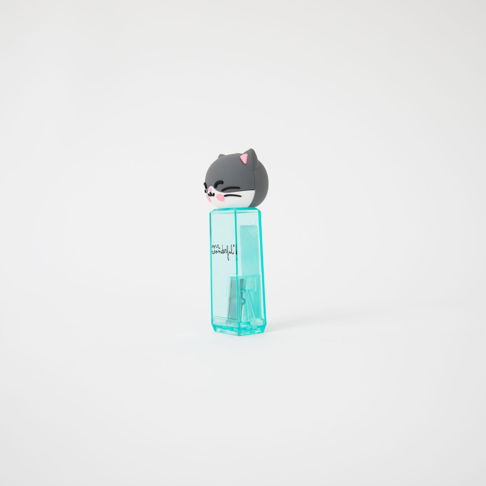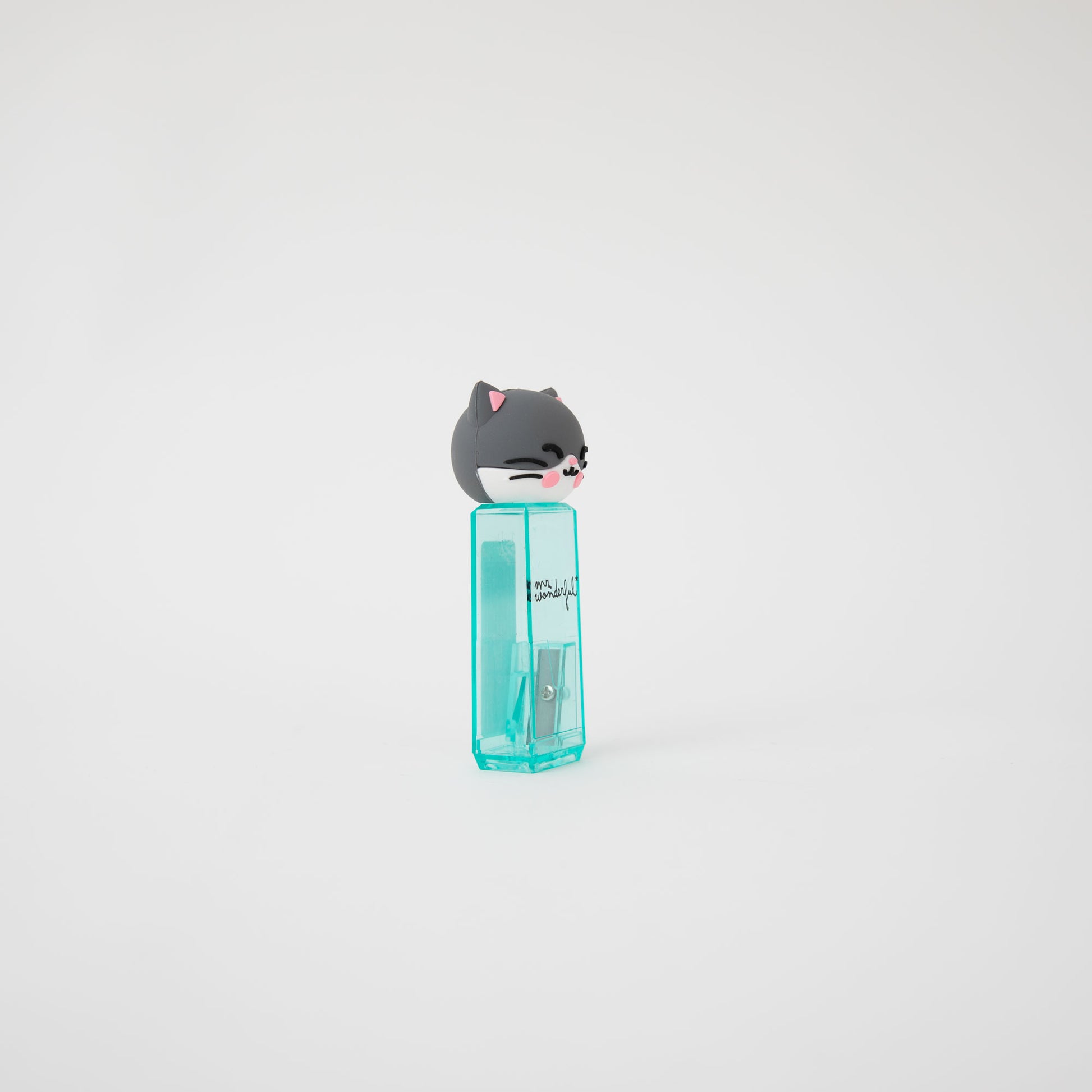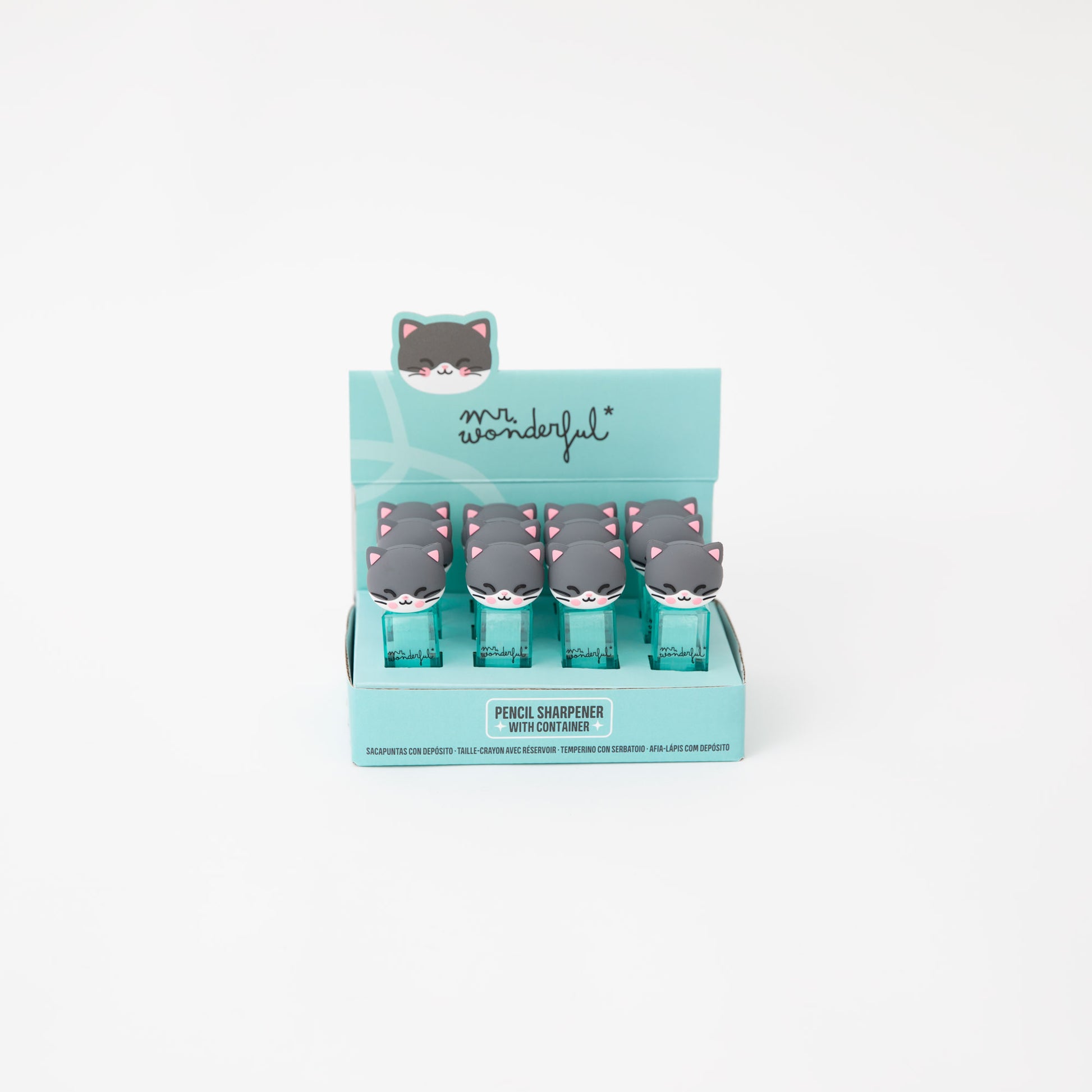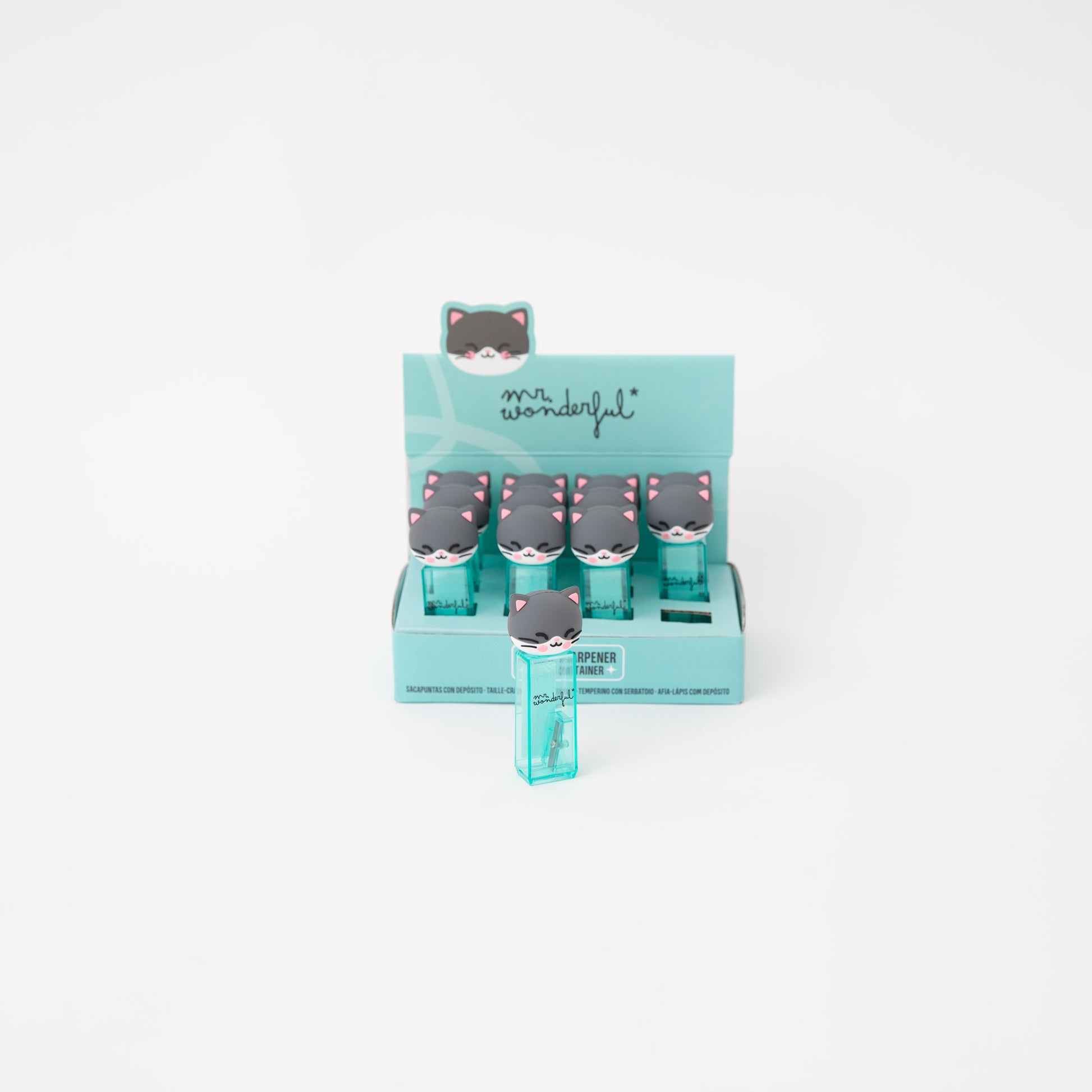 Sacapuntas con depósito y un gato Mr. Wonderful en su parte superior.