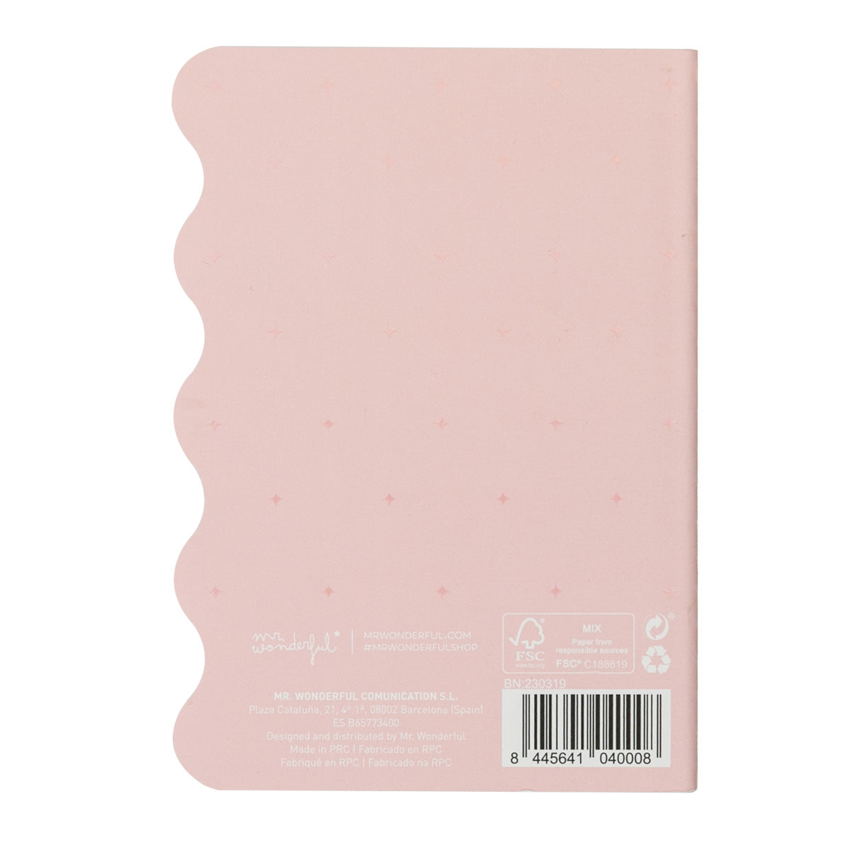 Libreta pequeña de tamaño A6, ideal para llevarla en el bolso o mochila. Cuenta con 72 páginas en su interior, realizadas con papel de 90 gr con certificado FSC, que garantiza que proviene de bosques gestionados de manera responsable. Los bordes de su portada y contraportada son ondulados, lo que le confiere originalidad.