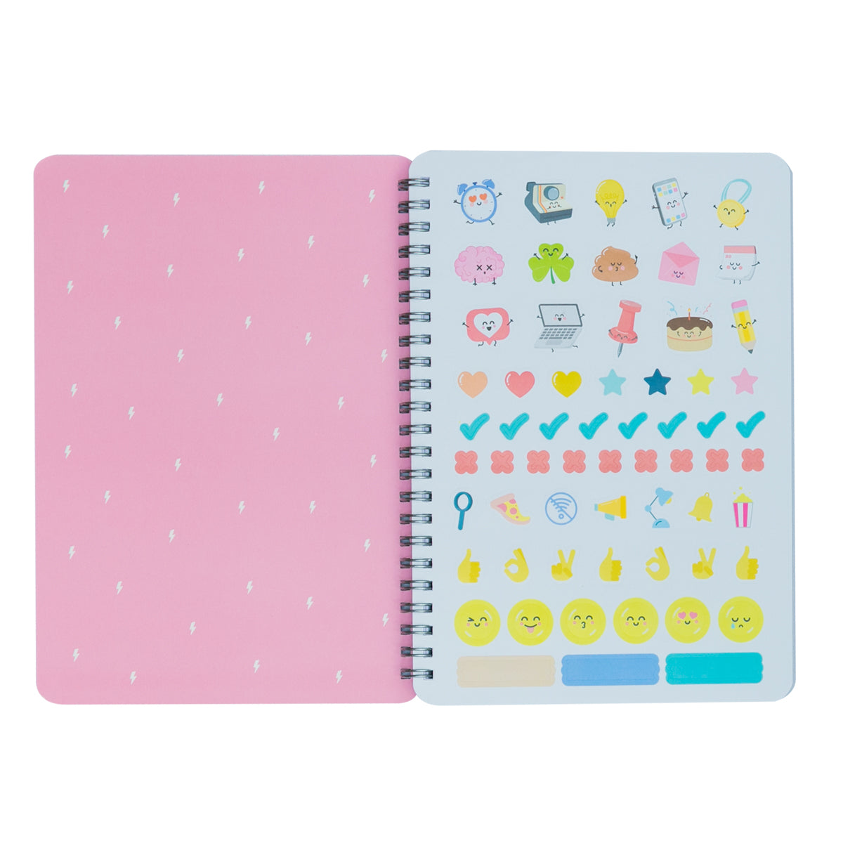 Quaderno in formato A5 con rilegatura a spirale, copertina rigida e 160 pagine di carta 80gr. con certificazione FSC, che ne garantisce la provenienza da foreste gestite in modo responsabile. Include un foglio di adesivi.