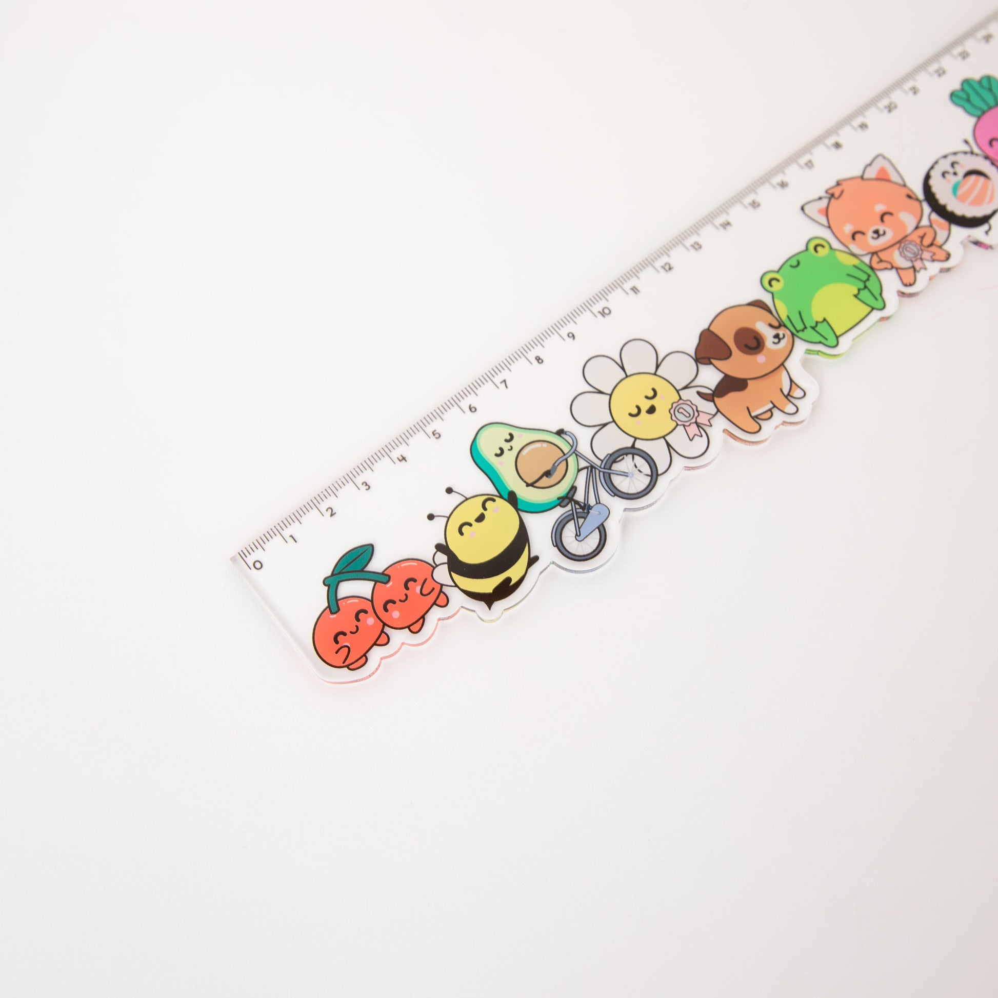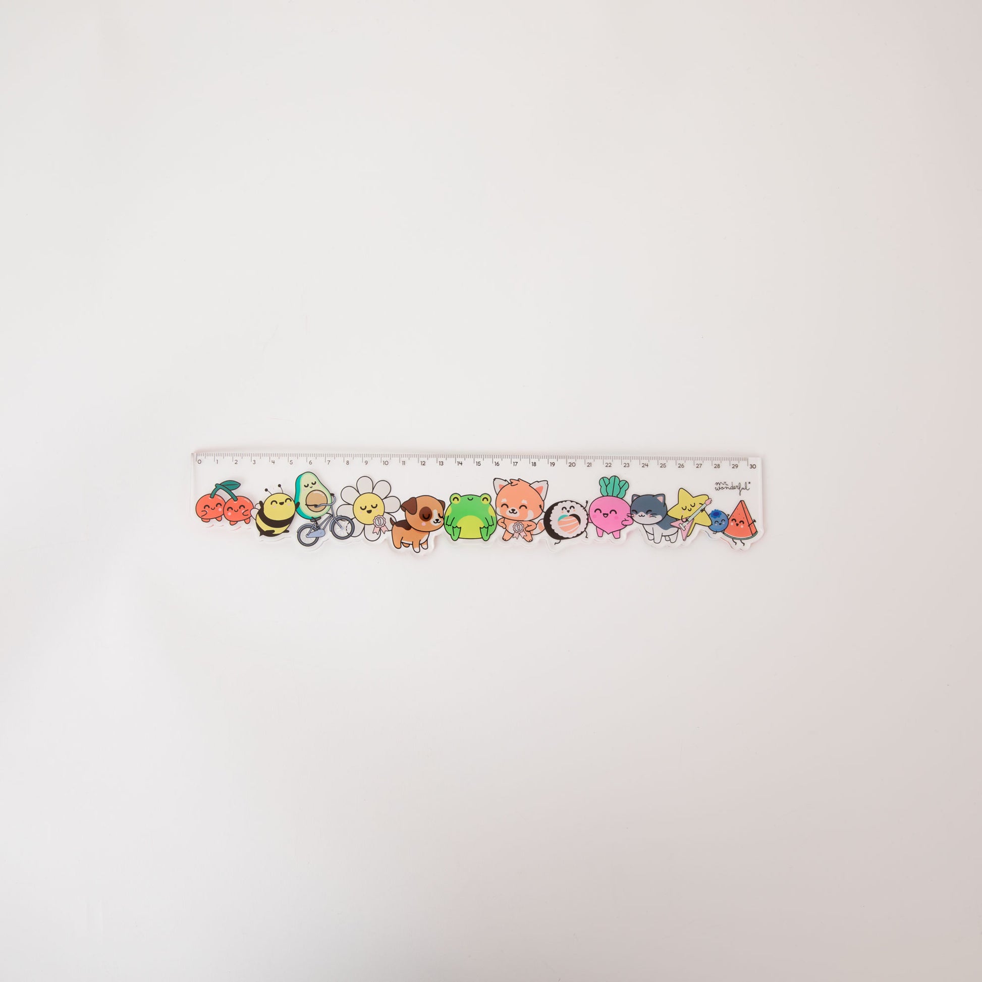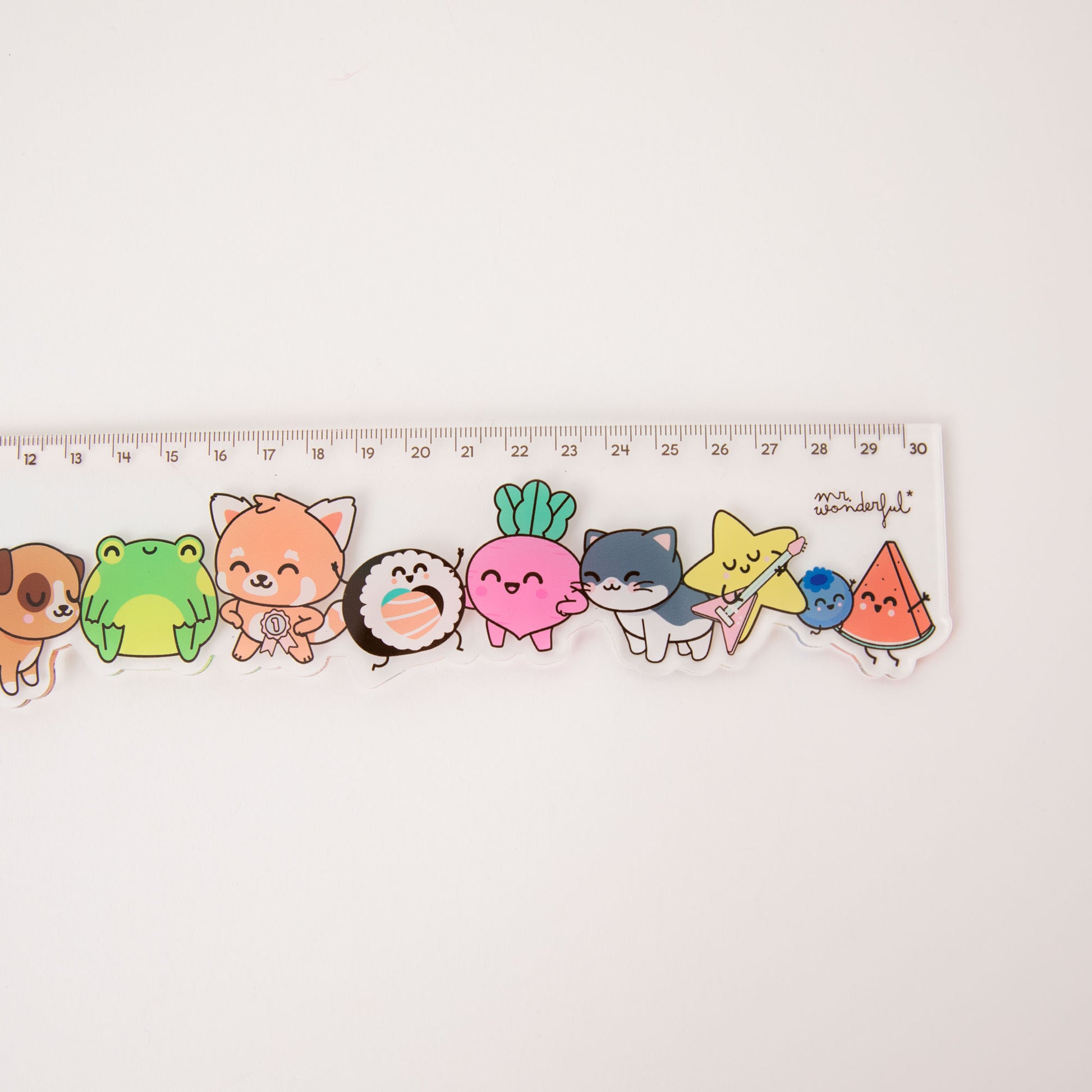 Regla de 30 cm de longitud, realizada en plástico. En su parte inferior cuenta con un divertido grupo de personajes Mr. Wonderful, que sobresalen de la regla formando su silueta.