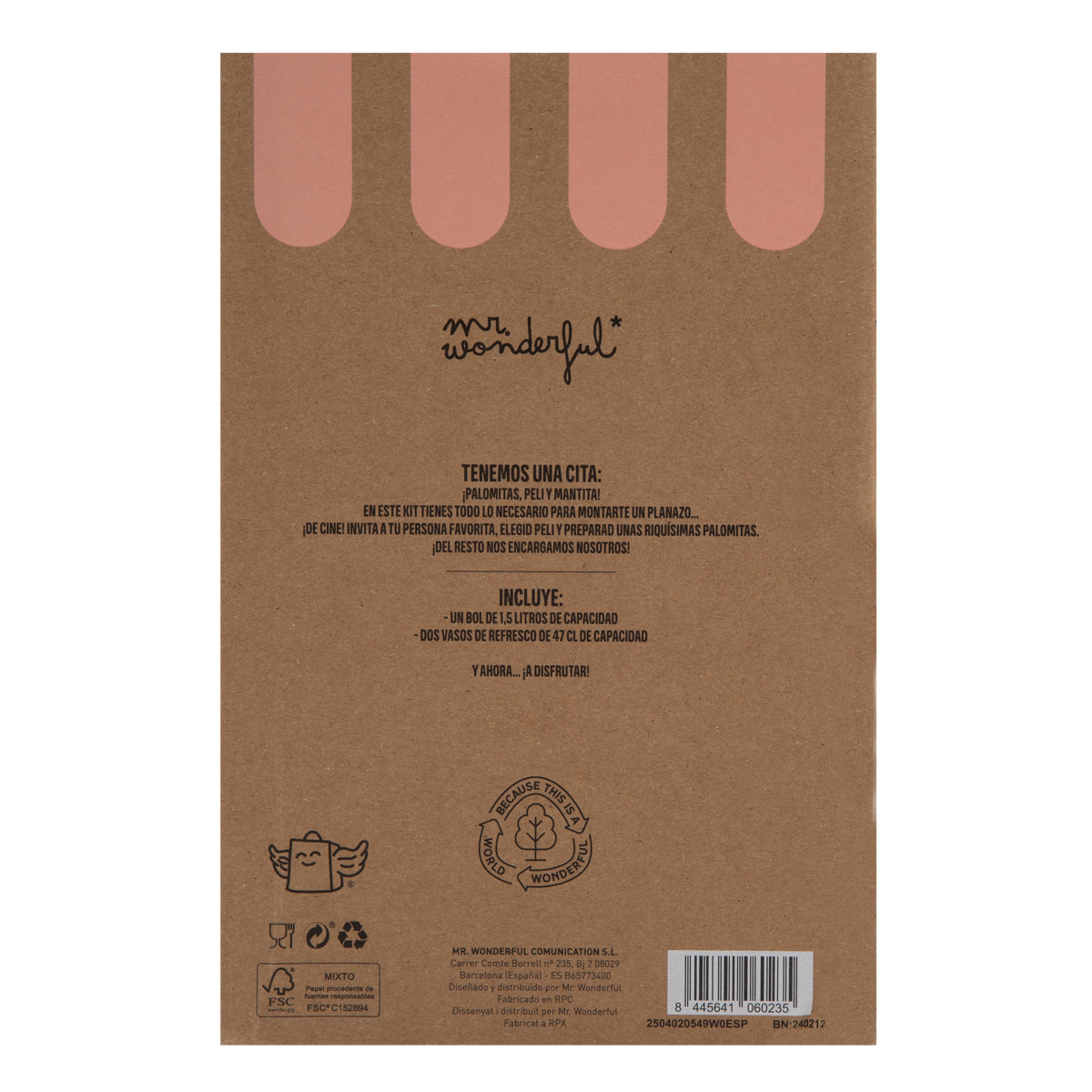 Set de bol de palomitas y dos vasos de refresco, todo ello fabricado en plástico libre de BPA y ftalatos. Resulta ideal para regalar en pareja.