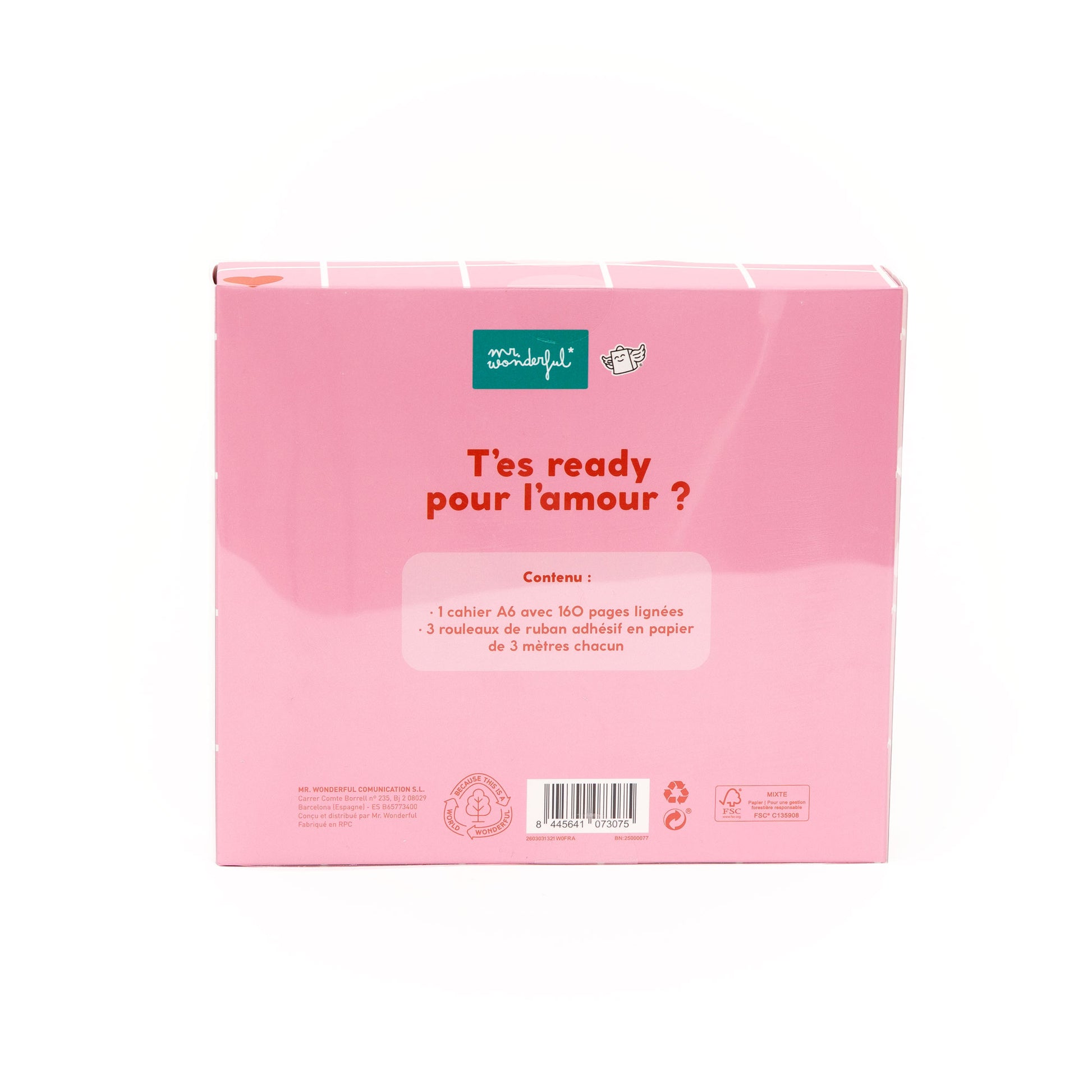 Le set comprend également 3 rouleaux de ruban adhésif en papier, ou washi tape, de 3 mètres de longueur et de 15, 20 et 30 mm de largeur respectivement, avec un design exclusif Mr. Wonderful – parfait pour écrire des mots doux, les accrocher avec le washi tape, puis les remettre dans le cahier pour les garder précieusement.
