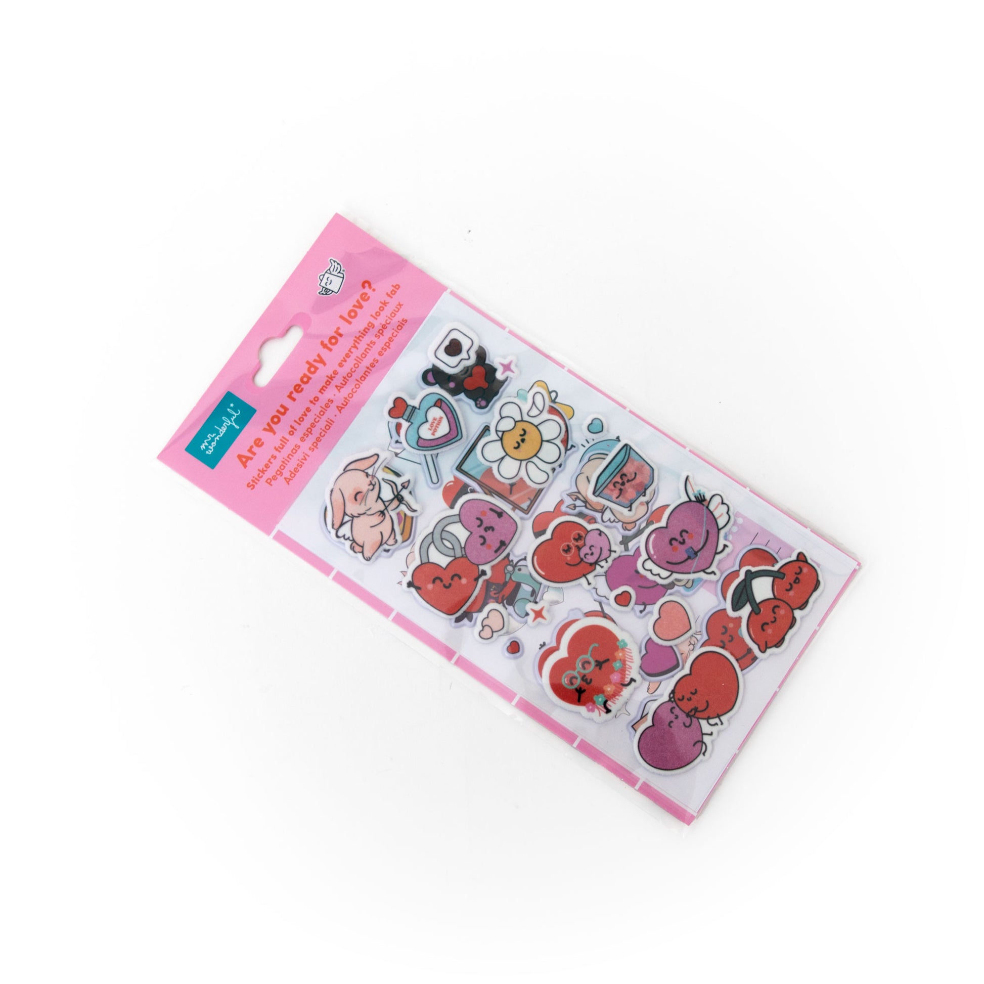 Blíster con 3 hojitas de pegatinas con temática amorosa y acabados especiales: