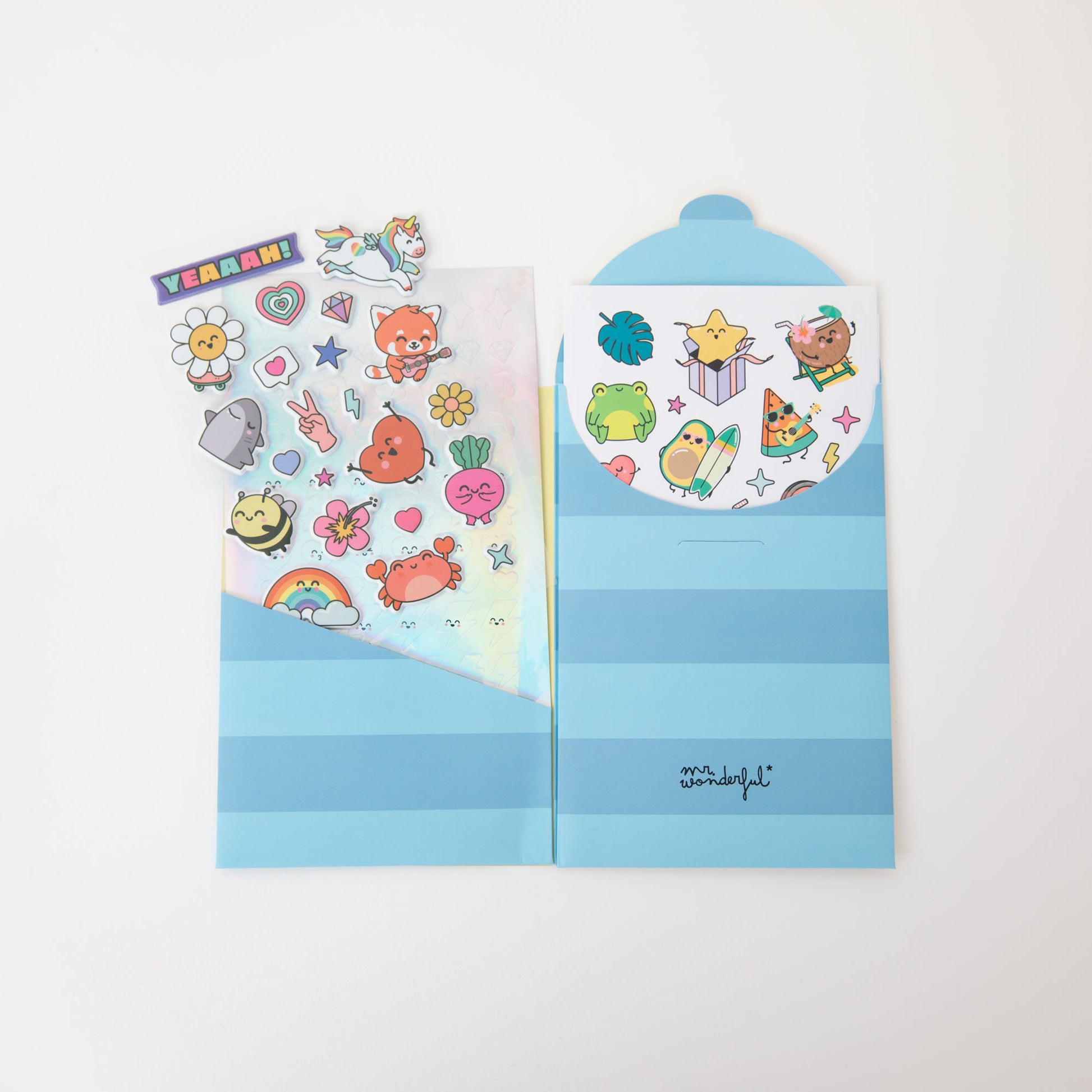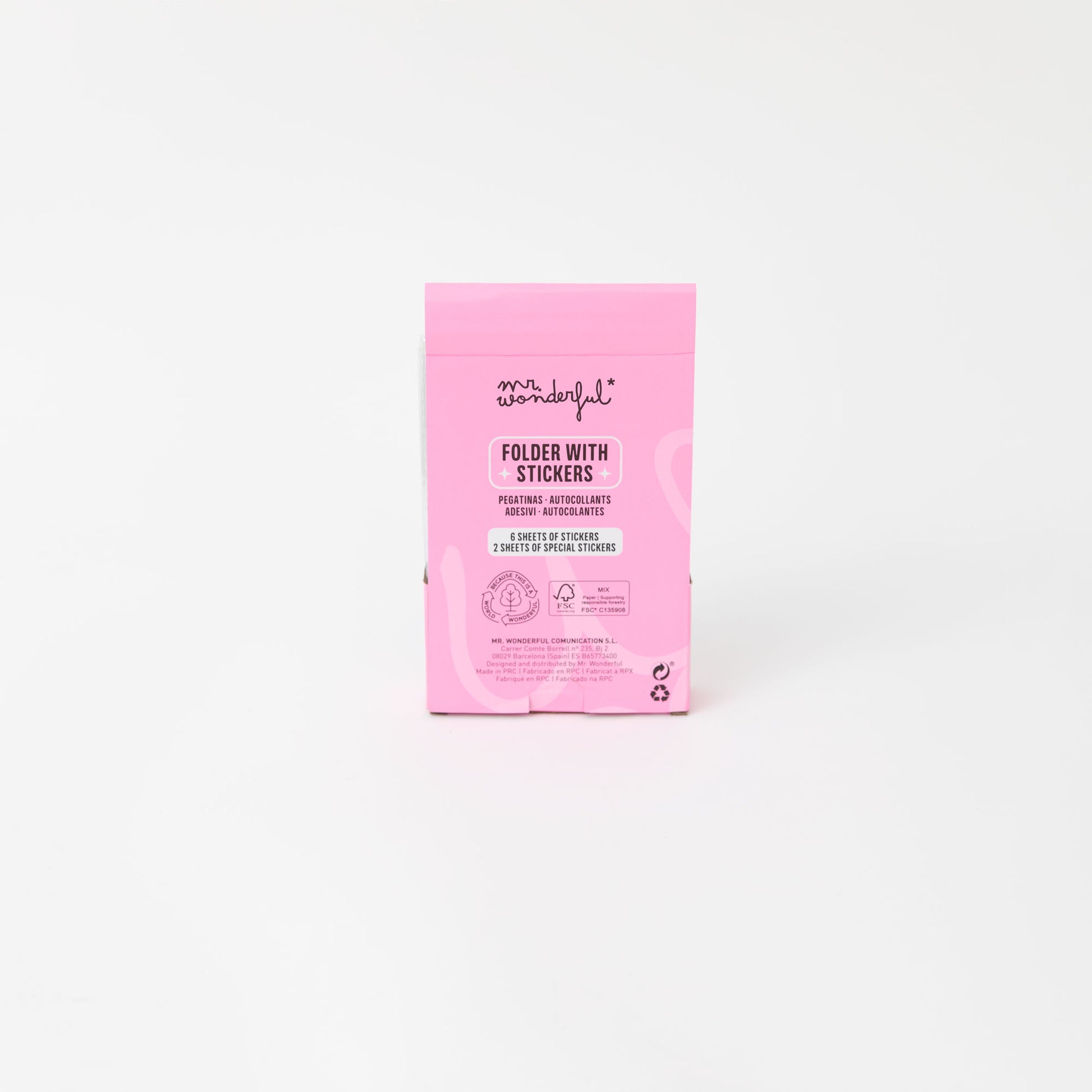 Pequeña carpeta con 6 hojas de pegatinas normales, 1 hoja de pegatinas con relieve y 1 hoja de pegatinas holográficas en su interior.