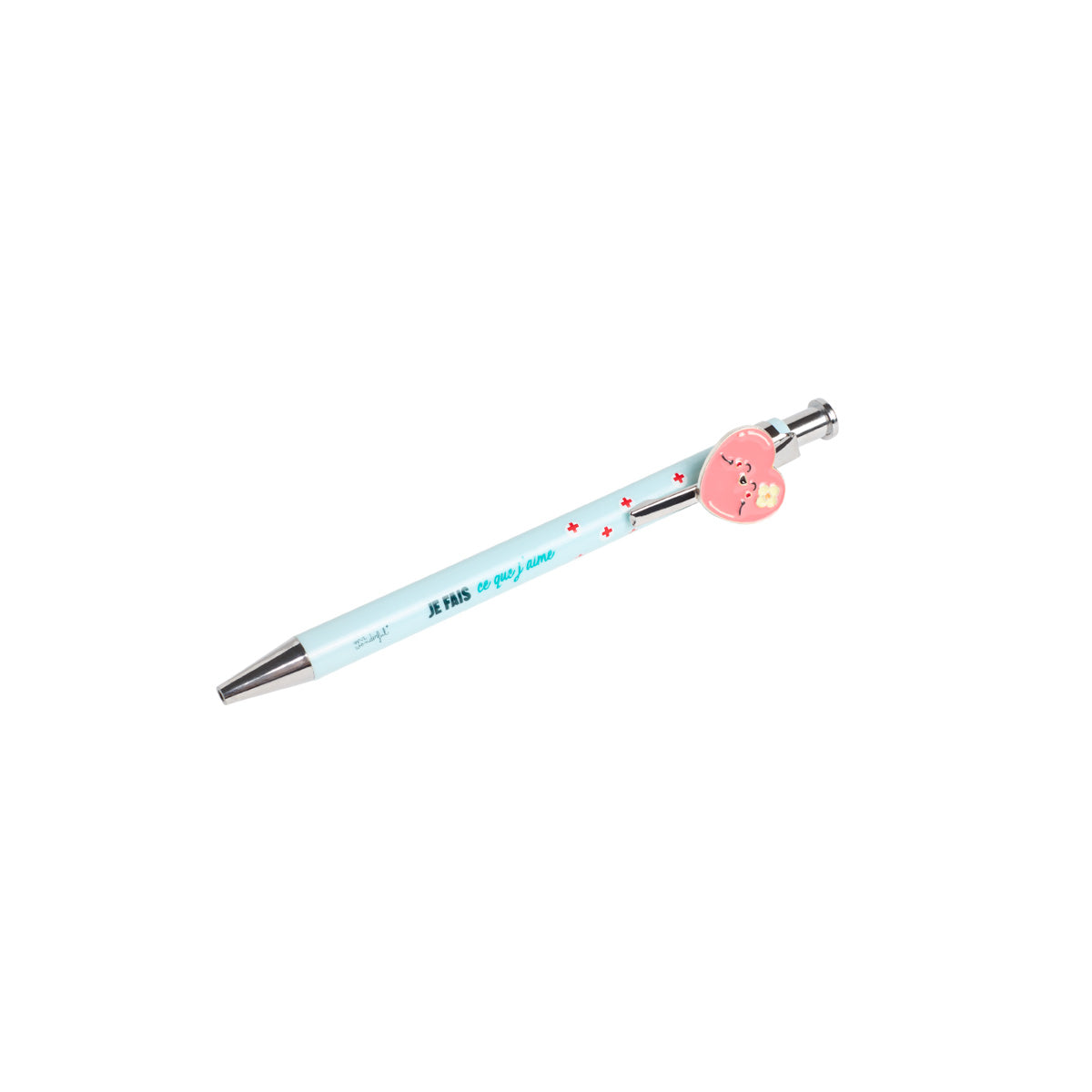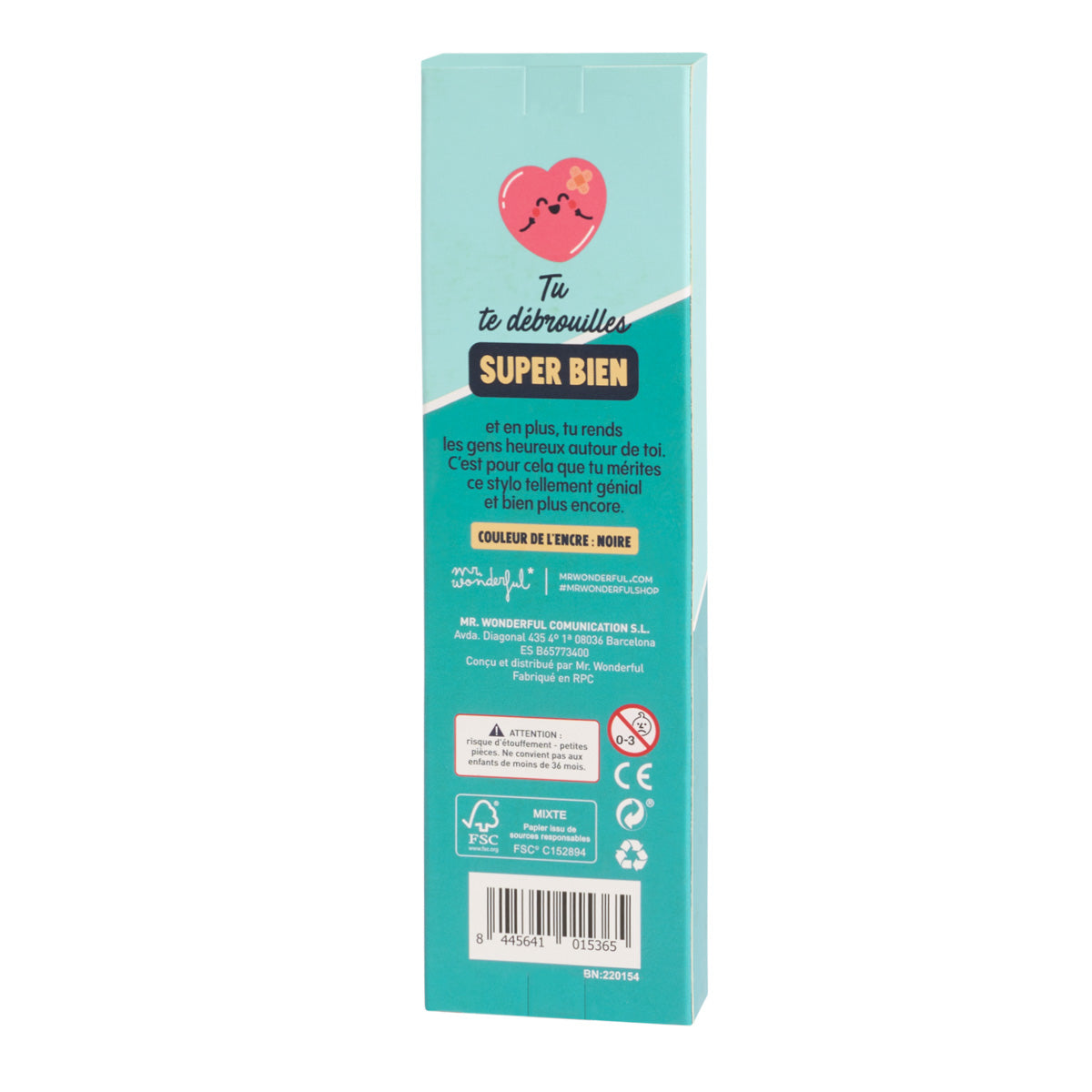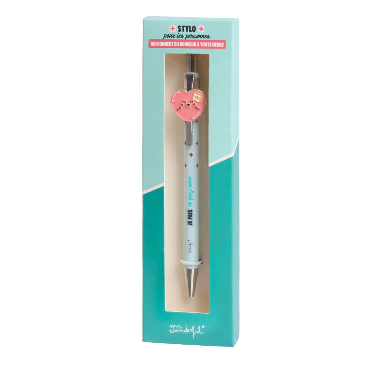 Stylo en métal avec un message de motivation et un badge avec un personnage Wonder lié au monde de la santé. La couleur de l'encre du stylo est noire.