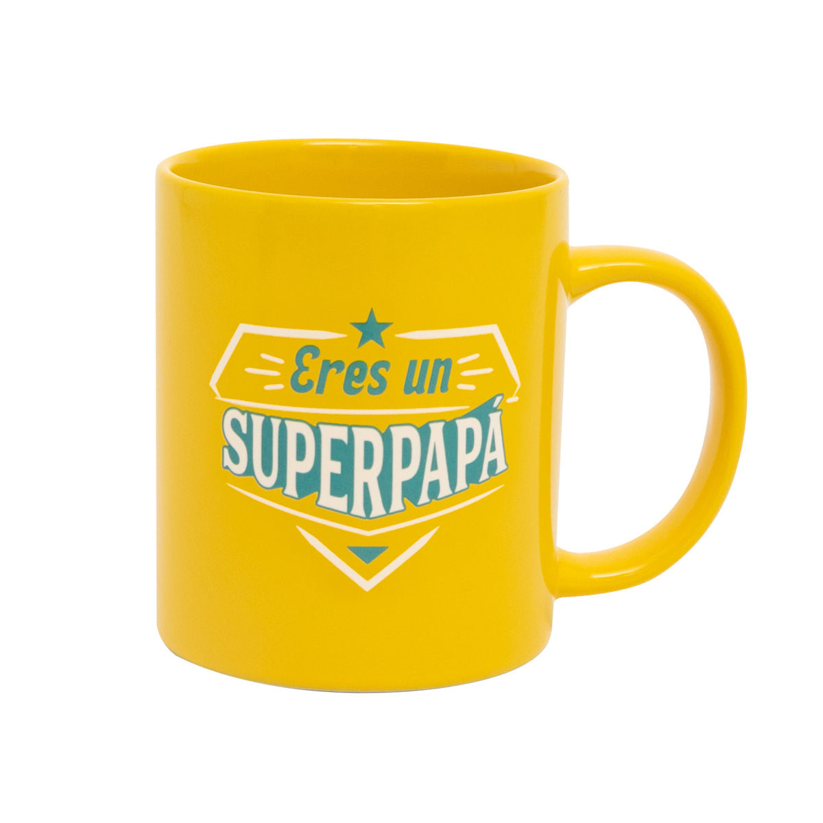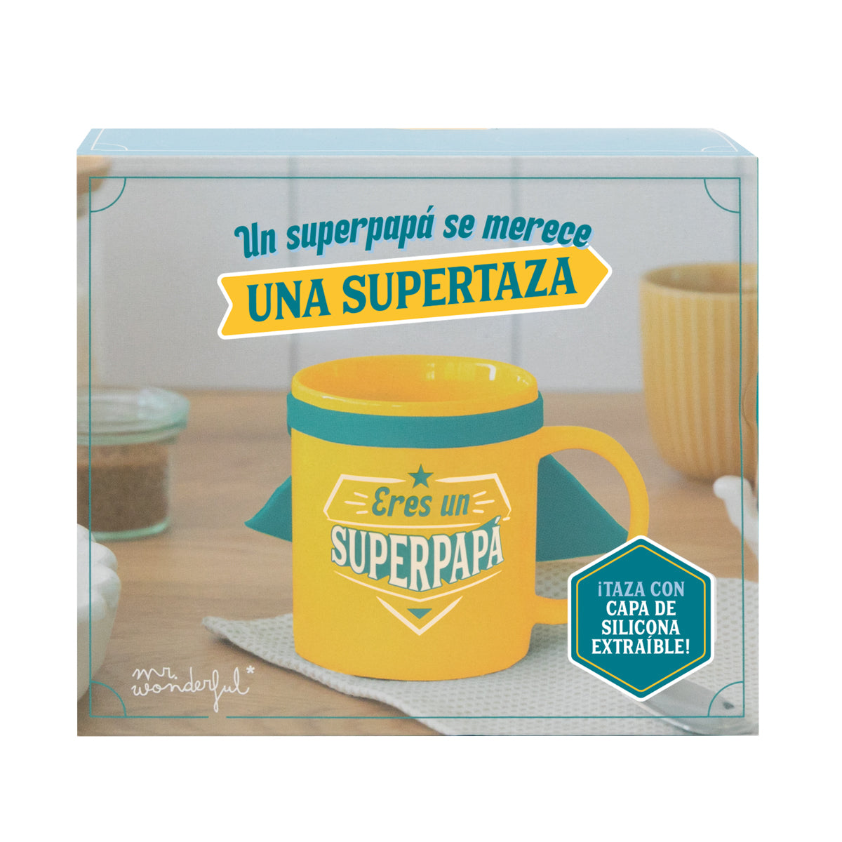 Llamativa taza de cerámica, con mensaje y una original capa de superhéroe extraíble hecha en silicona.