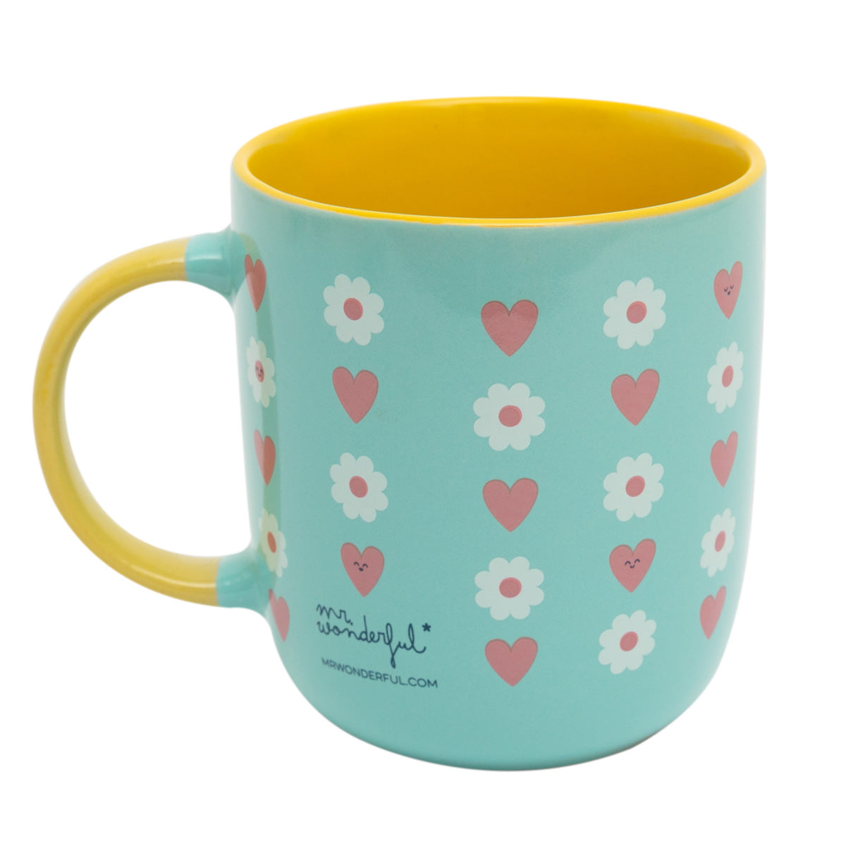 Taza de?cerámica con?mensaje dirigido a primas. El color exterior es?distinto al?interior y?al?del?asa?y, además, el estampado de?fondo de?la?taza se?distribuye a?lo?largo de?toda su?superficie exterior, lo que?le?aporta originalidad.