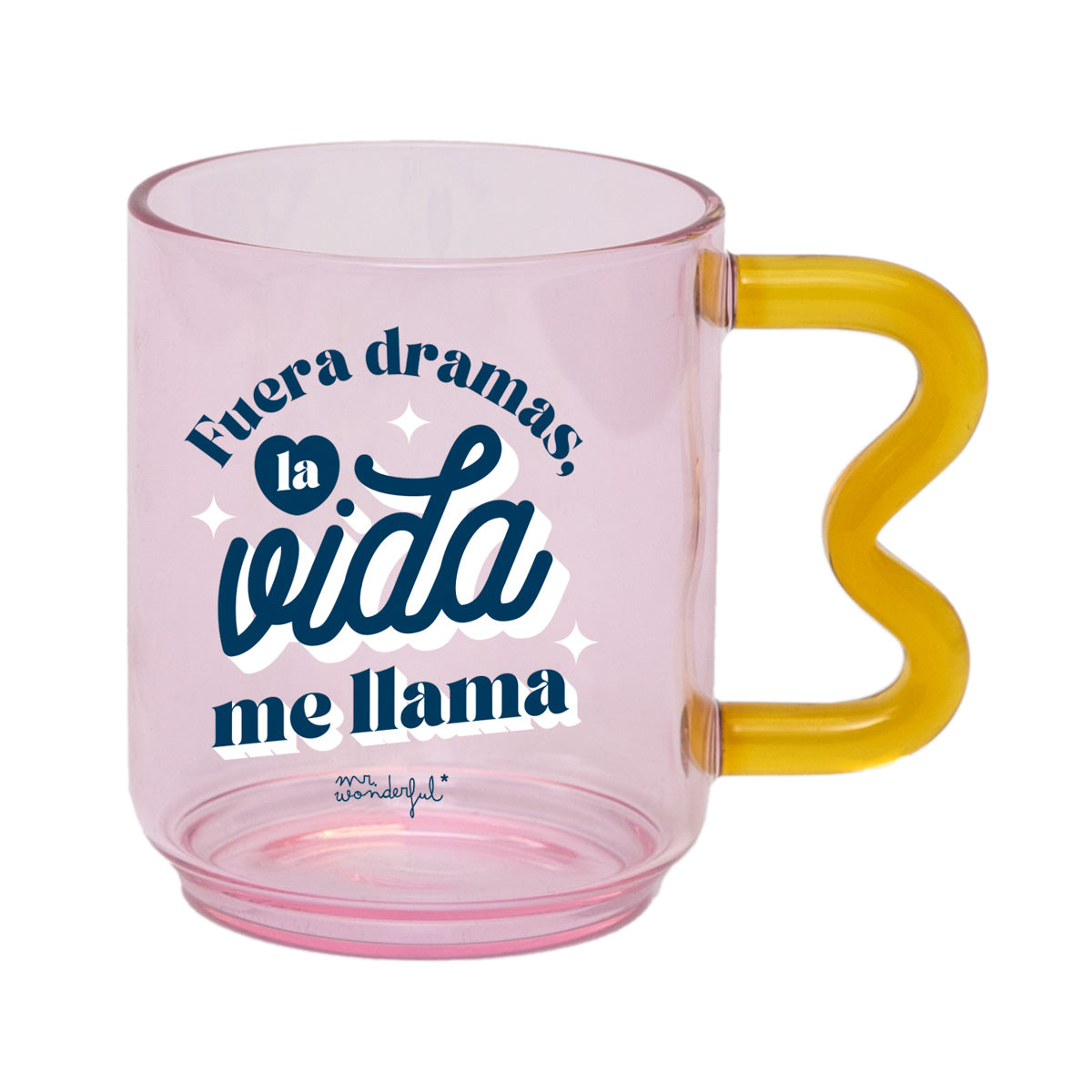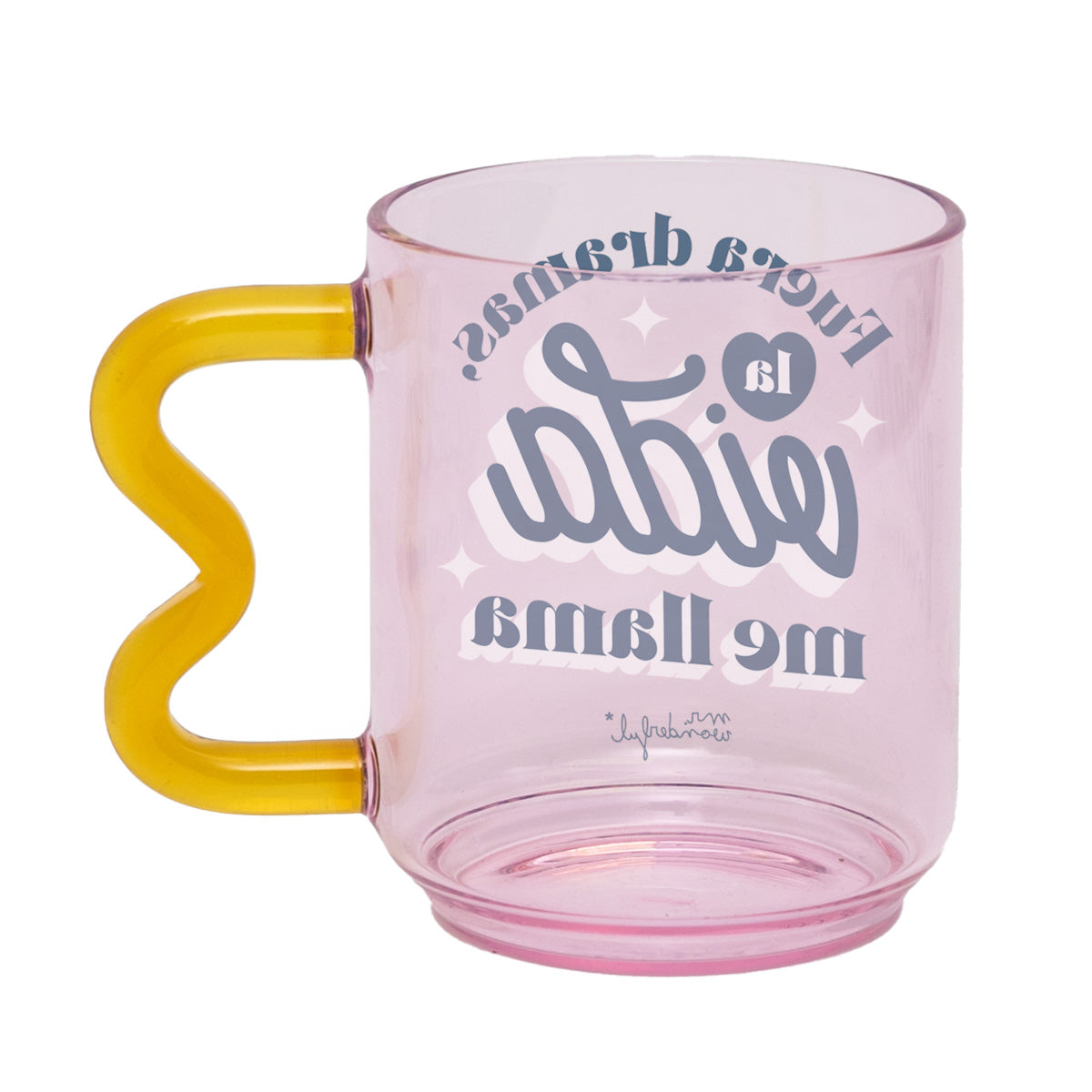 Taza realizada en vidrio, totalmente estampada y con un divertido mensaje en español, lo que la hace perfecta tanto para regalo como para autoconsumo. Su asa tiene forma ondulada y ergonómica, lo que, además de hacerla muy cómoda a la hora de usarla, le aporta un toque de originalidad.