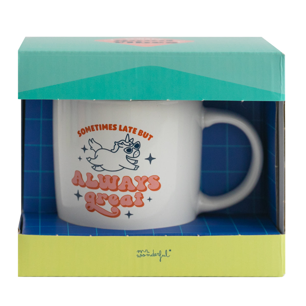 Taza de?cerámica con?un mensaje divertido en ella, en inglés. Cuenta con?un?mensaje en?su?interior que?complementa el?mensaje exterior.