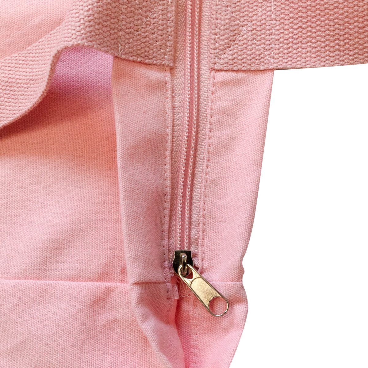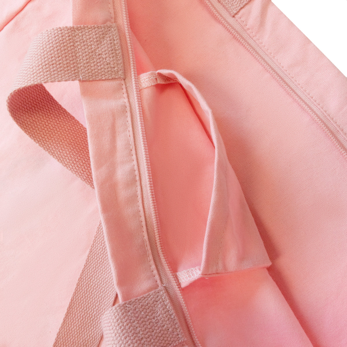 Bolsa de tela estilo tote bag, realizada en algodón, con asas para colgar y un bolsillo interior con cierre de cremallera.