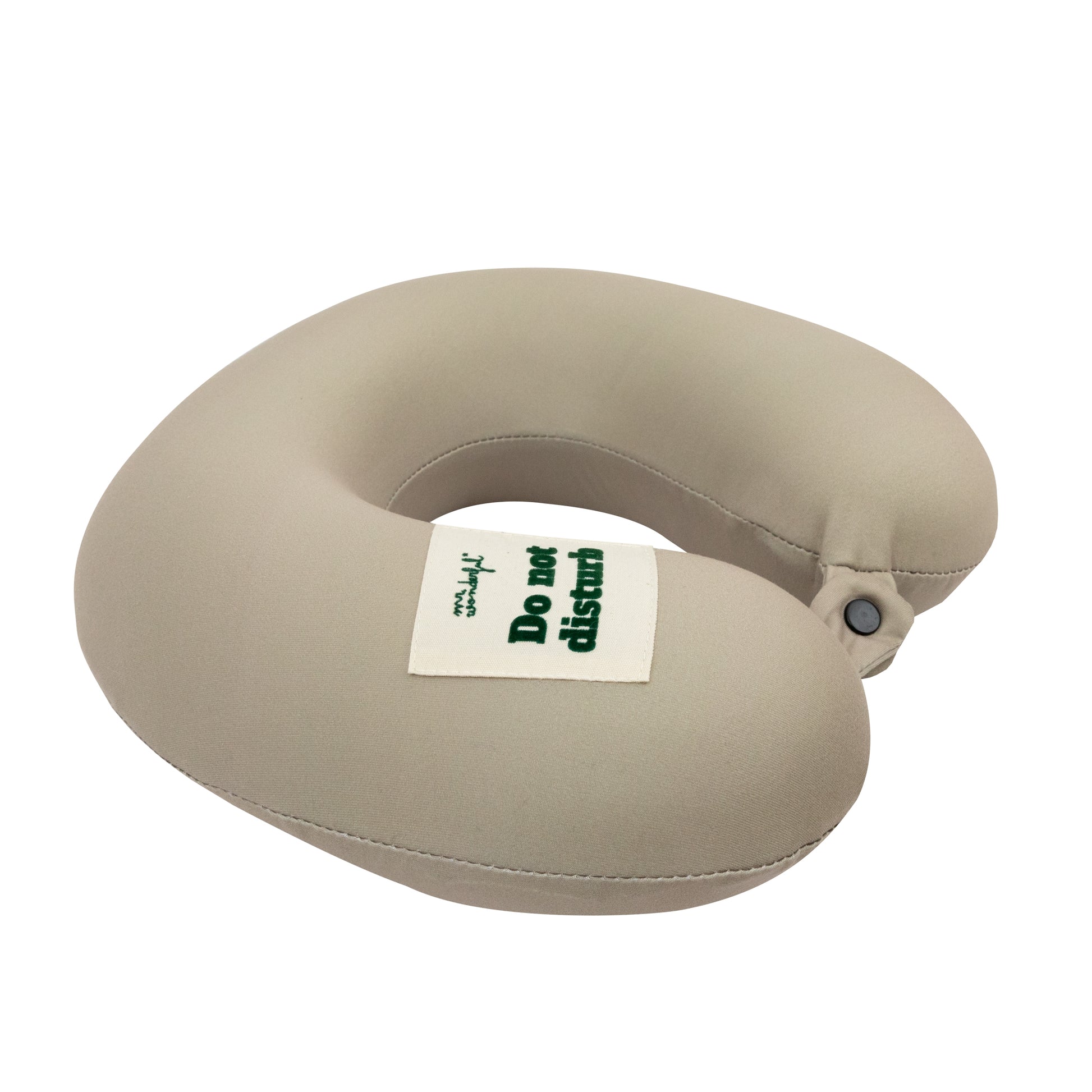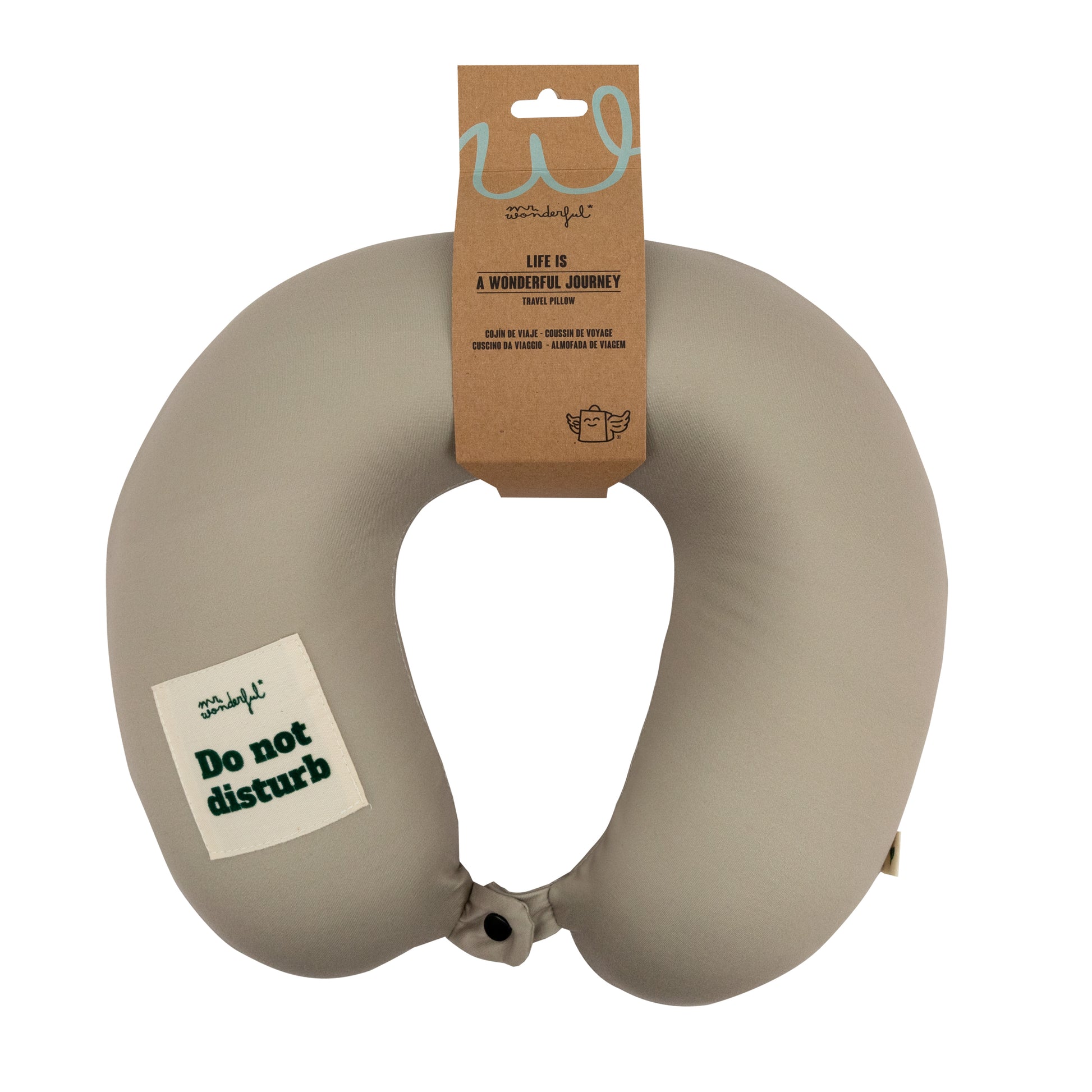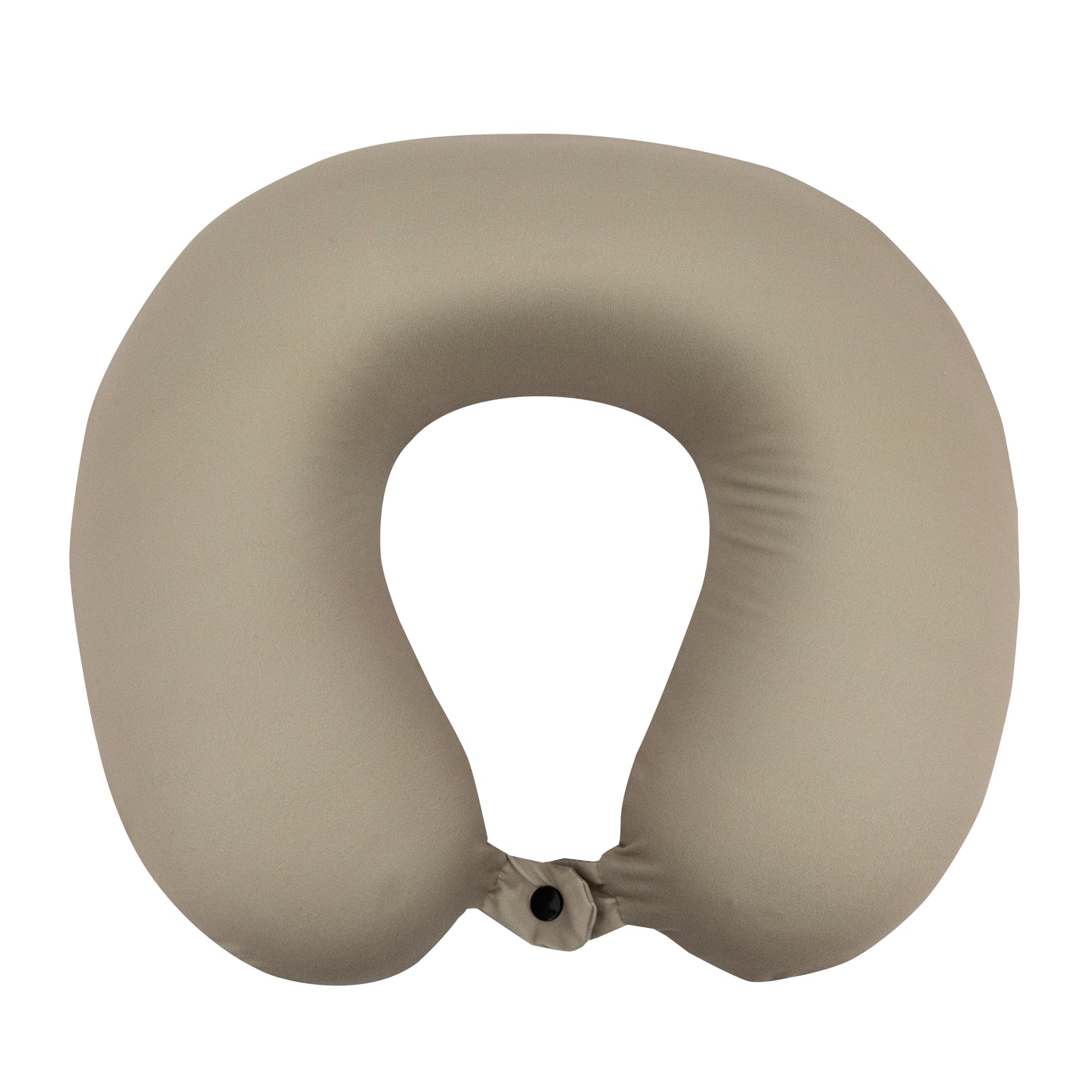 Cojín de viaje con botón de clic en su parte frontal para ajustarlo du rante el uso.