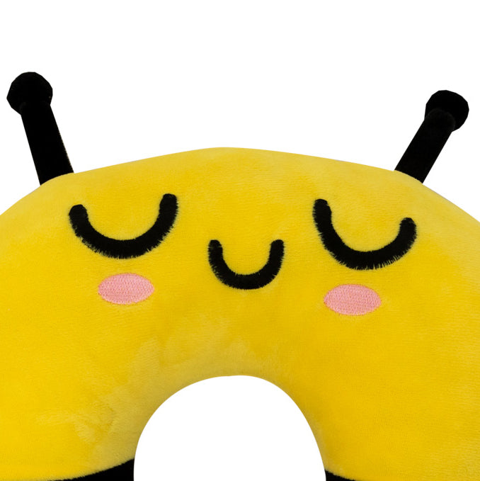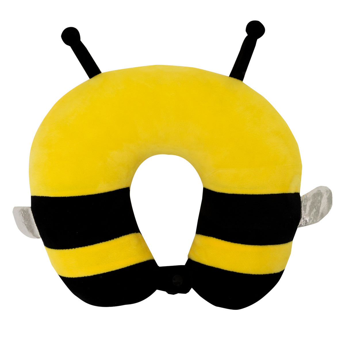 Set de viaje infantil compuesto por un cojín cervical y un antifaz, con forma de abeja. El antifaz está realizado en poliéster y el cojín cervical en algodón PP 3D, lo que lo hace muy cómodo y práctico al uso.