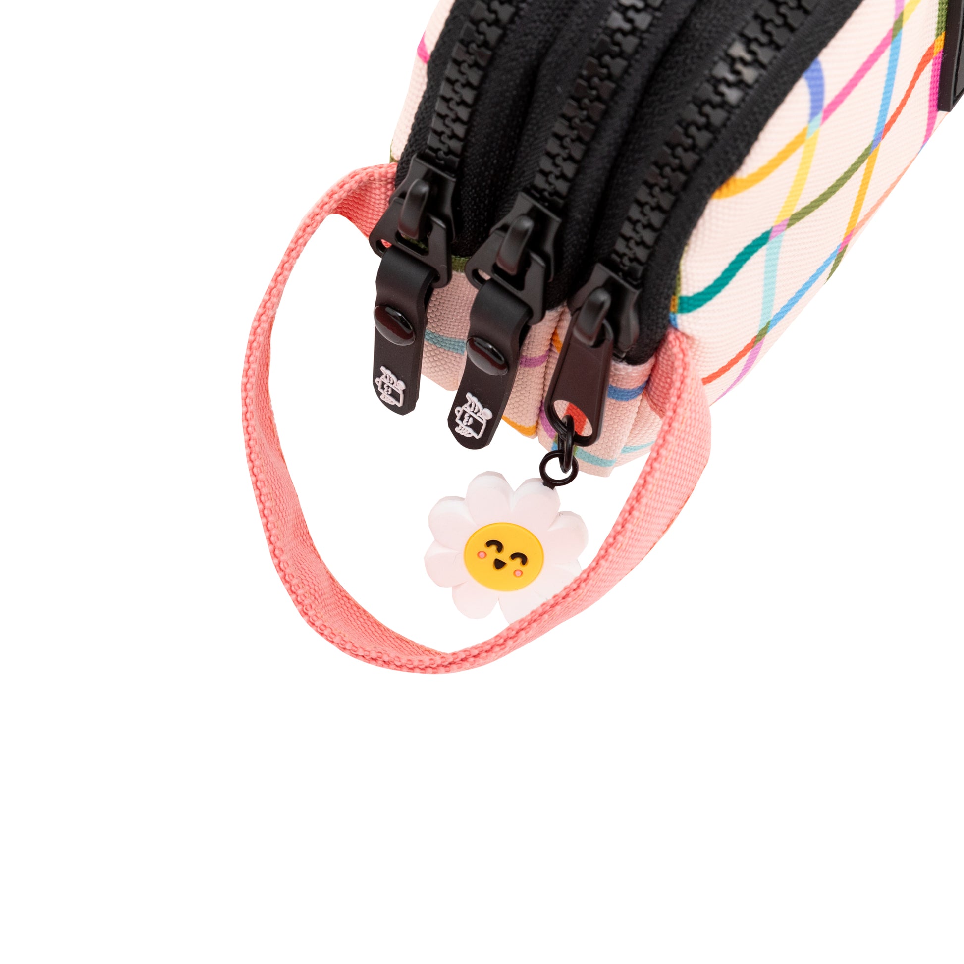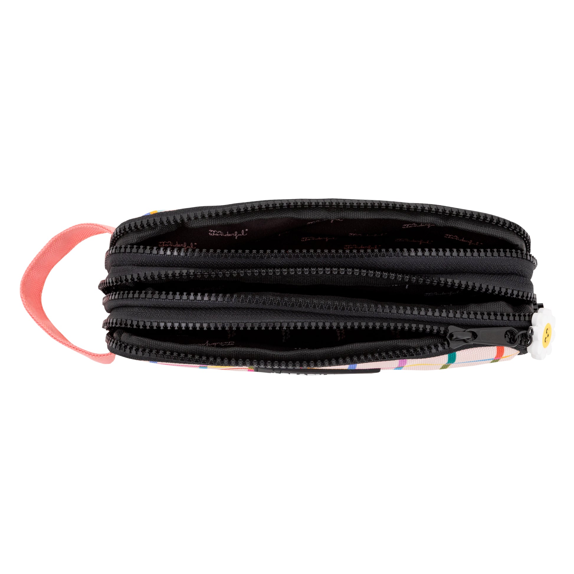 Estuche con tres compartimentos individuales y tres cierres de cremall era. El tirador de una de estas cremalleras tiene forma de margarita Mr. Wonderful, lo que le ap orta originalidad. Realizado en rPET, un material 100 % reciclable obtenido a partir del reciclaje de botellas de plástico.