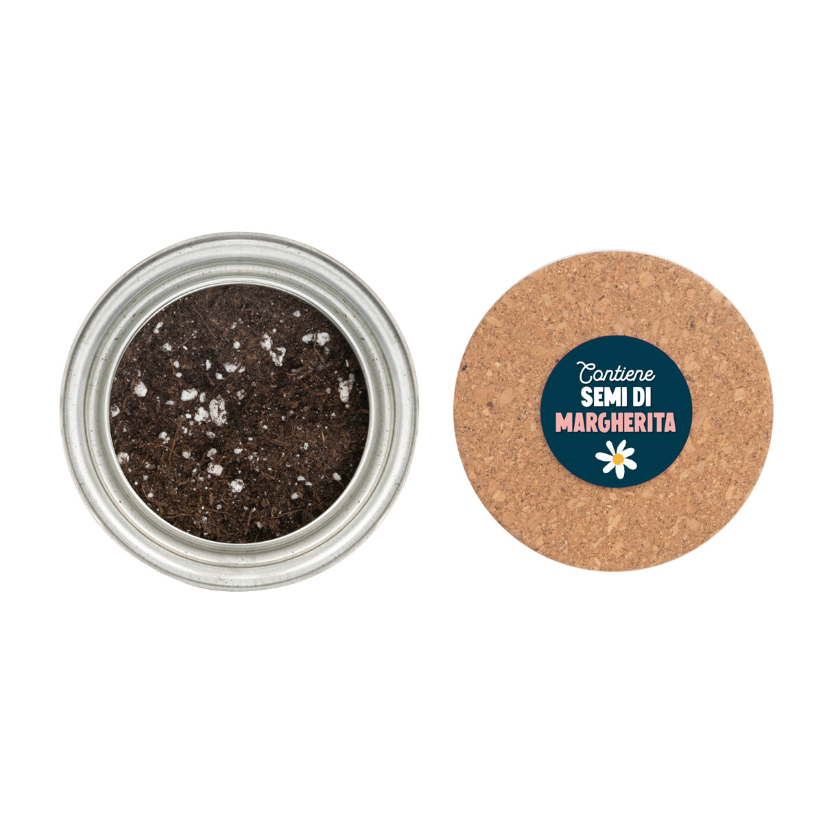 Barattolo di alluminio con frase e semi di margherite da piantare all'interno. Include la terra e un tappo di sughero.