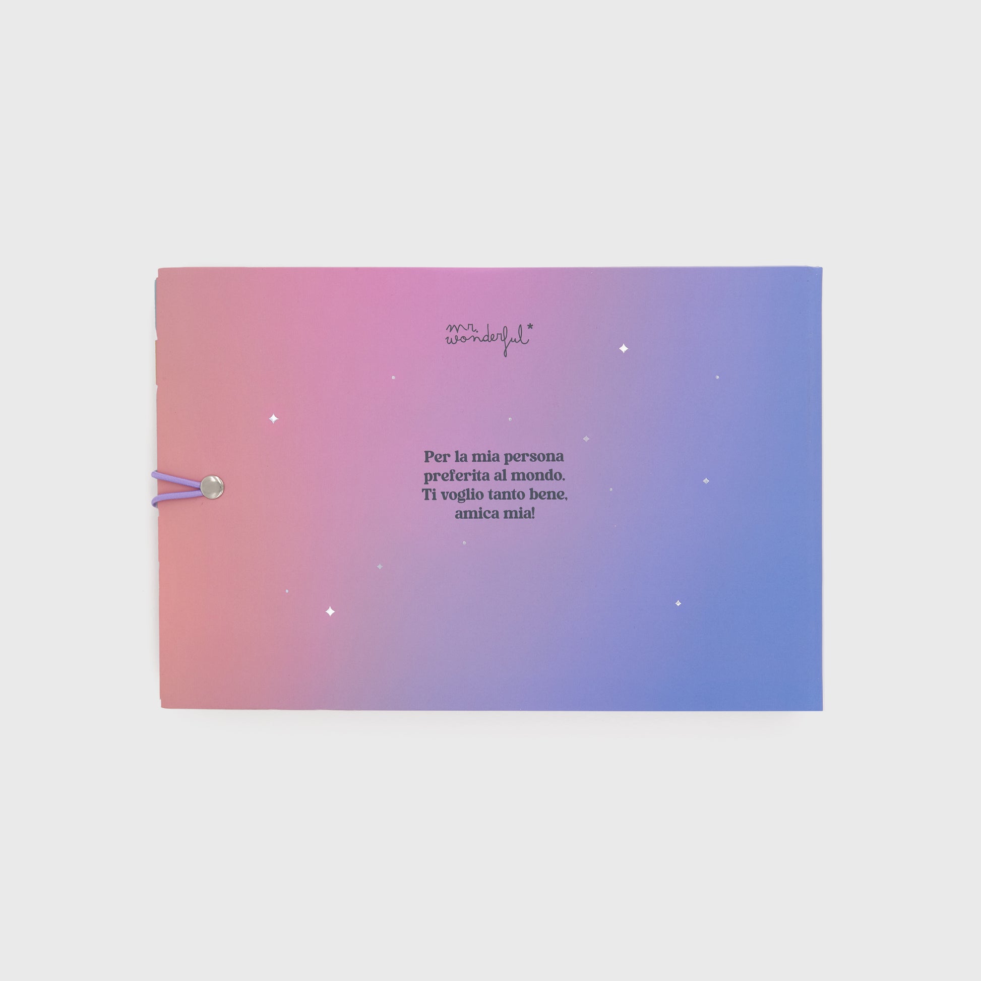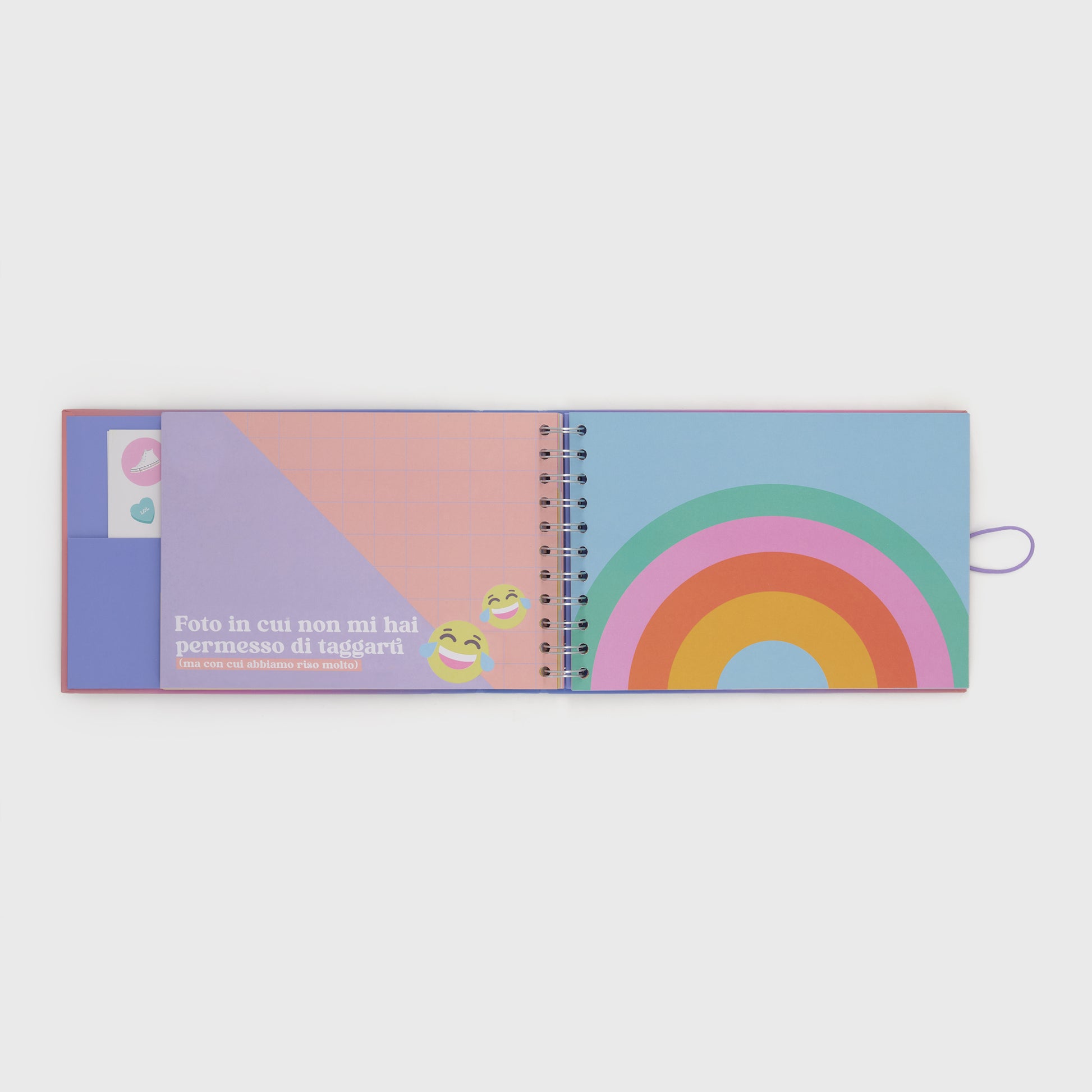 Album photo sur le thème des amis, pensé pour cette période et offert en cadeau à un ami. Avec 64 pages (alcune avec messages pour accompagner la photo ou piccoli testi da compleare), 8 feuilles d'adhésifs pour décorer et personnaliser l'album et un compartiment interne pour préserver la richesse et les feuilles sciolti. De plus, sur la première page, il y a un espace pour écrire le nom de la personne qui recevra le cadeau, accompagné d'un beau texte de dédicace.