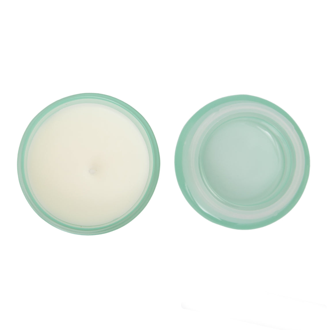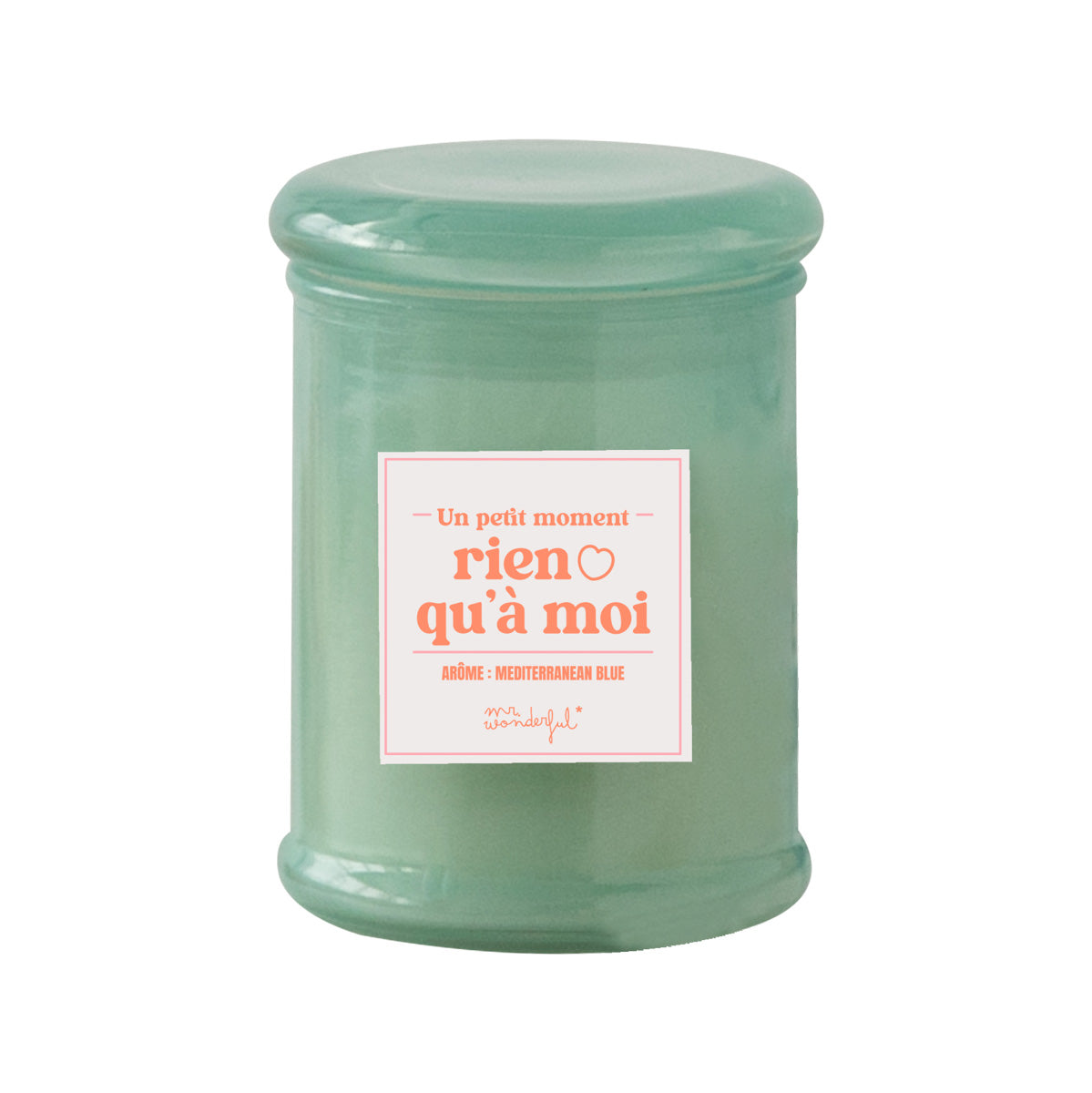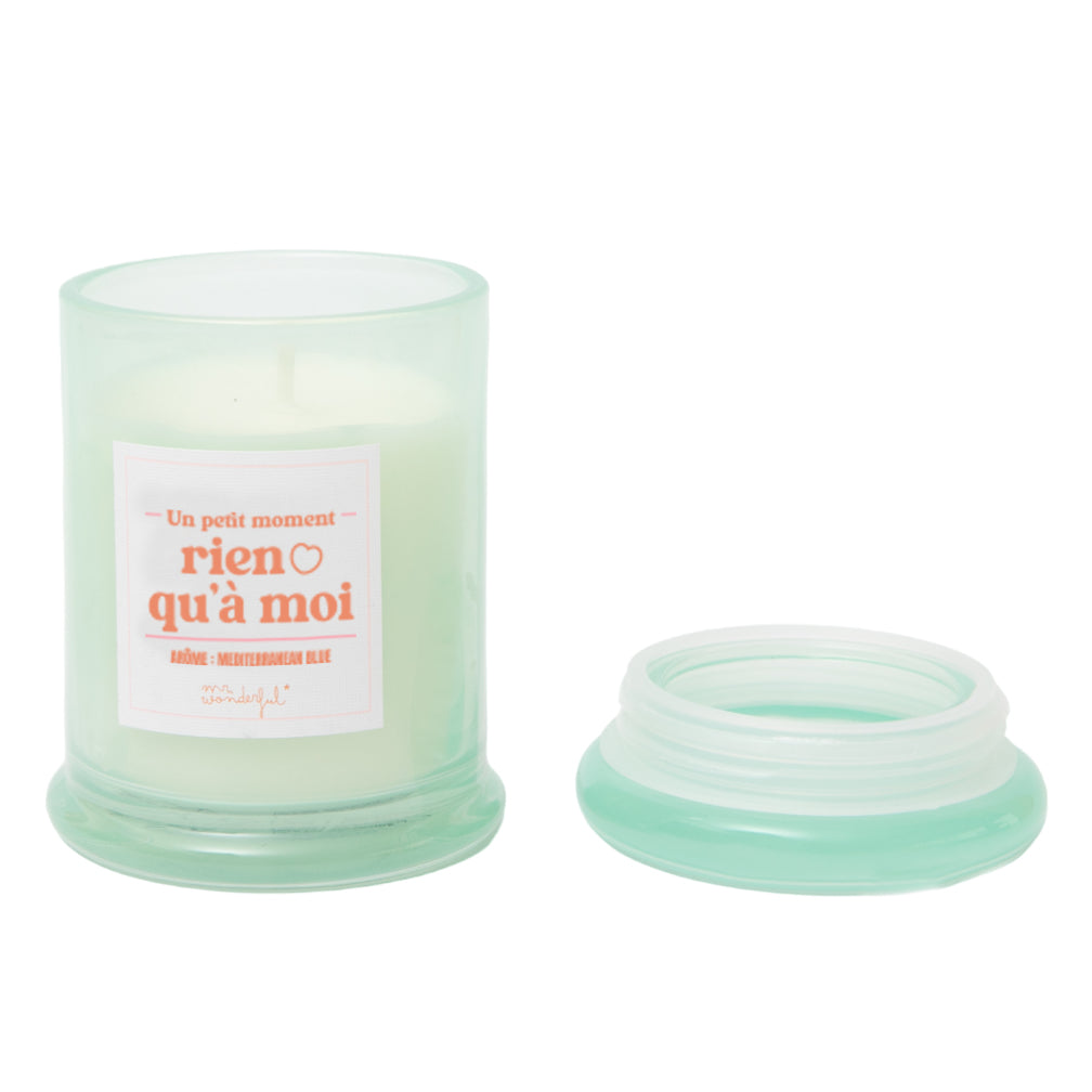 Bougie parfumée fabriquée en cire végétale en Espagne. Le récipient et le couvercle sont tout deux en un. Le message est présenté sur une étiquette sur papier texturé, de manière à donner un air tridimensionnel. Arôme : Bleu méditerranéen.