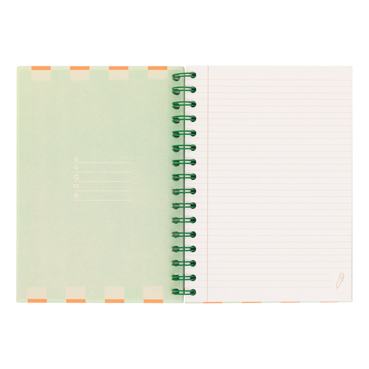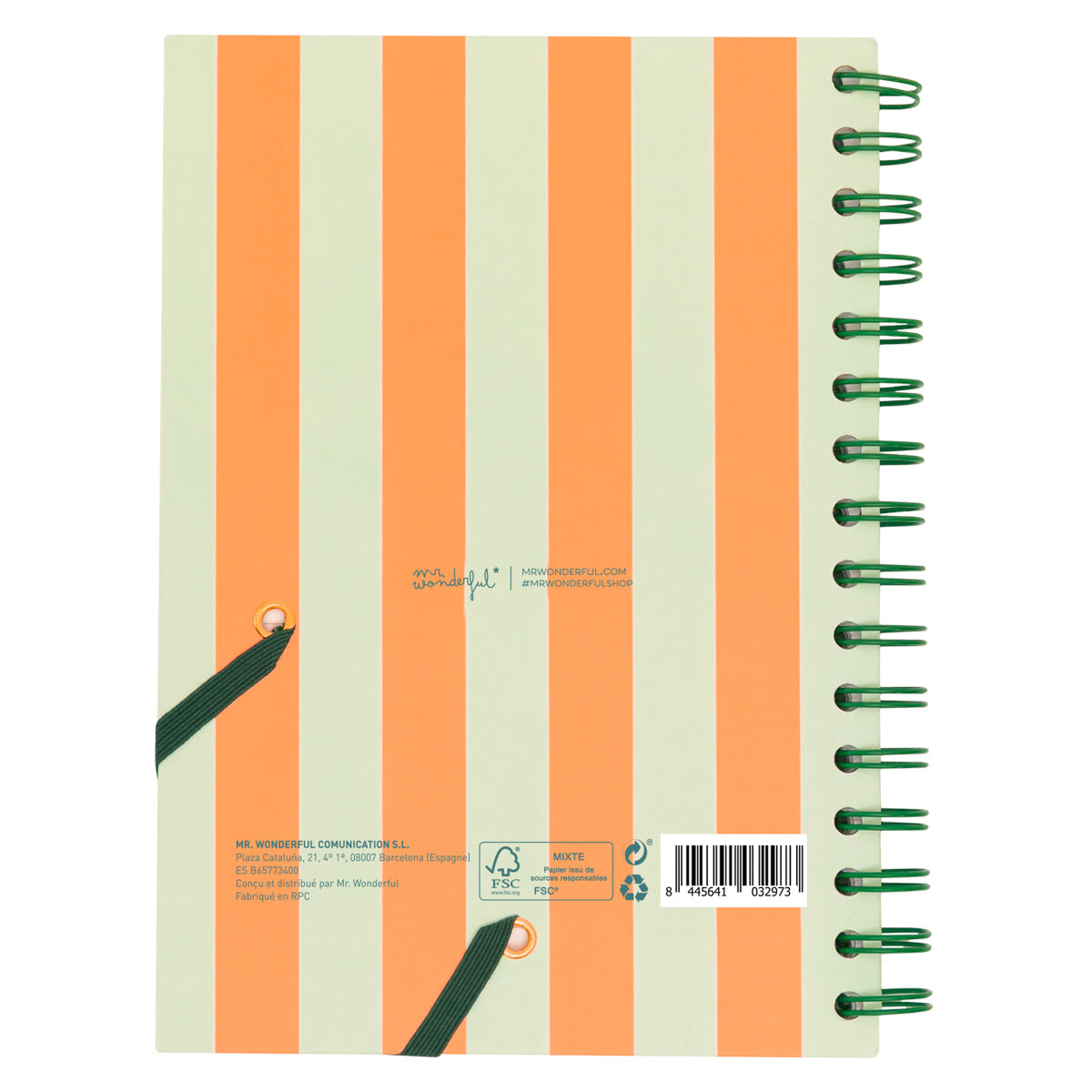 Coffret orange au format A5 avec une couverture rigide et un décor en spirale. Avec 125 pièces de papier de 90 g et une certification FSC qui garantit une fabrication de papier issu de forêts respectueuses de l'environnement. Le cahier présente des feuilles lignées et une ferreture élastique. Il comprend une feuille d'autocollants.