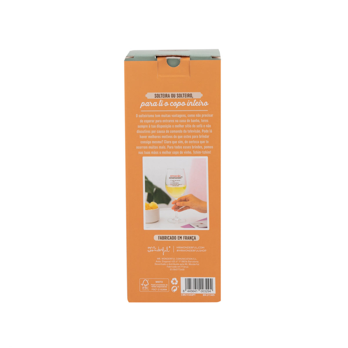 Nous qui profitons au maximum du célibat, savons que cela comporte de nombreux avantages et, chaque jour qui passe, nous découvrons de nouvelles raisons de trinquer au bonheur d’être célibataire. Un Monsieur Merveilleux veut vous offrir le meilleur cadeau pour célibataires, parfait pour ces toasts infinis. Sera-t-il plus difficile de retrouver votre maison exactement comme vous l'avez laissée avant de partir ? Ou que me dites-vous du sentiment de pouvoir que vous avez de savoir que le commandement de la télévision n'appartient qu'à vous et que vous pourrez toujours choisir le film ou la série que vous souhaitez regarder à chaque instant ? De plus, vous n’avez pas besoin de rivaliser avec l’une des conquêtes du côté du canapé. Il n'attend que votre arrivée pour vous recevoir avec ses oreillers moelleux et cette couverture prête à vous accompagner dans vos moments de détente, que vous appréciez tant. Et maintenant, nous allons perdre quelques secondes de notre temps précieux pour réaliser la merveille que la salle de bain est toujours disponible pour les mergulhares entre la mousse, sans interruption. Cela n'a pas de prix ! Et donc, on pourrait continuer pendant des heures, mais on ne veut pas prendre plus de temps, il faut être fou pour faire son travail et on aura cette tasse qui ne se fixe pas ou plus déprime possible. Nous adorons trinquer avec vous !
