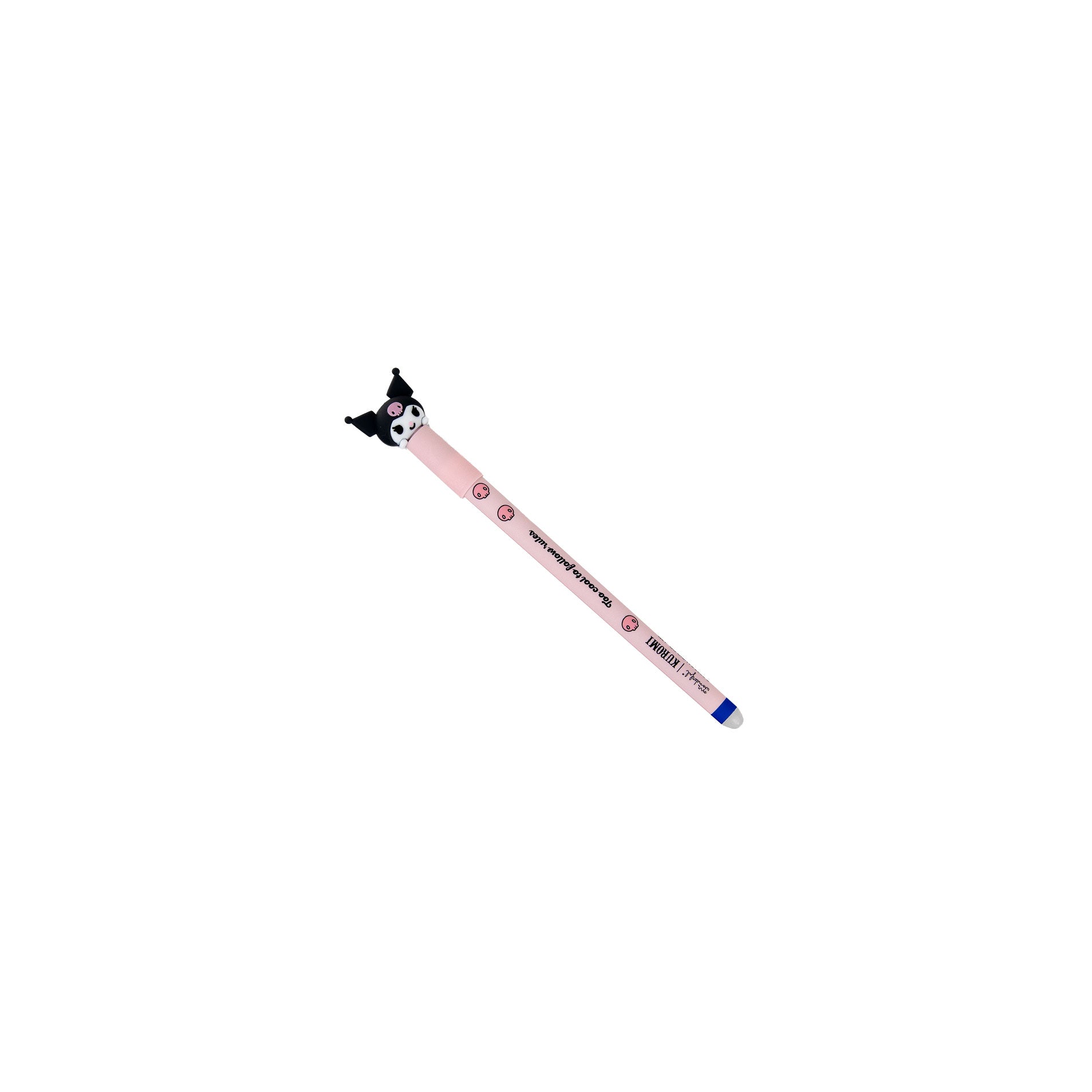 Boli con tinta borrable de color azul y Kuromi, la amiga más rebelde de Hello Kitty, en uno de sus extremos. Mensaje del bolígrafo: